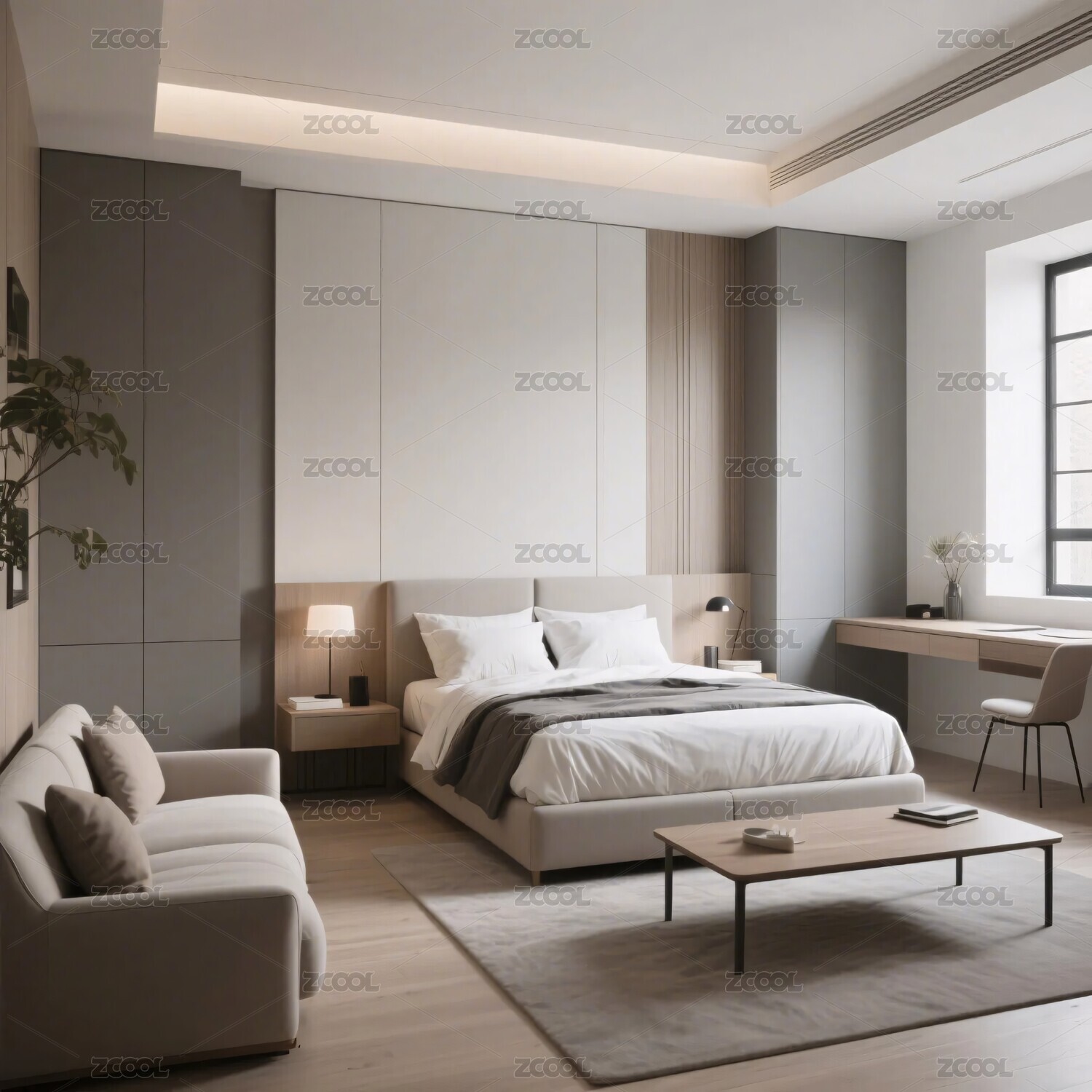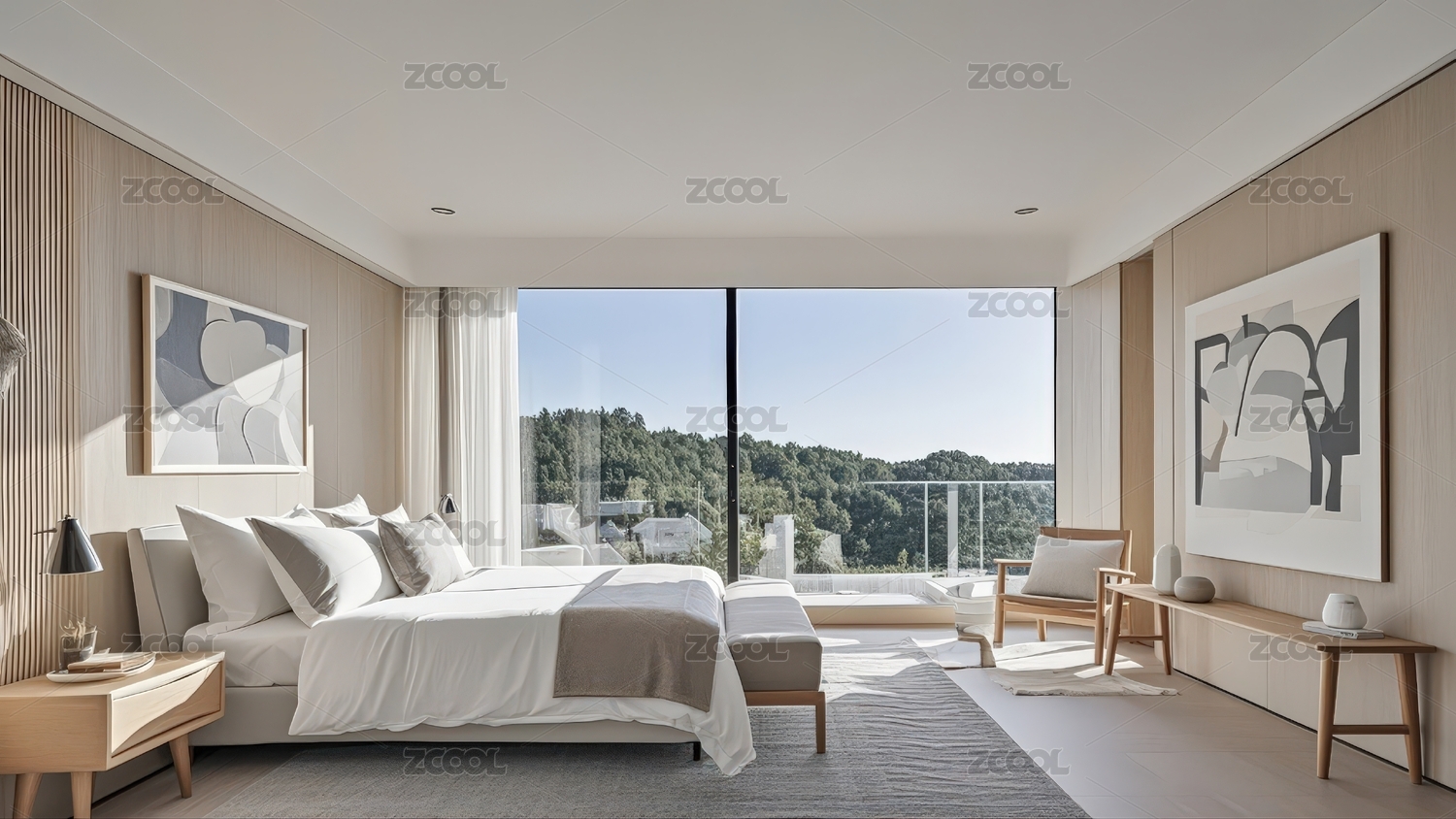 舒适,卧室,木质,落地窗,窗帘,地毯,床,床头柜,现代,简约