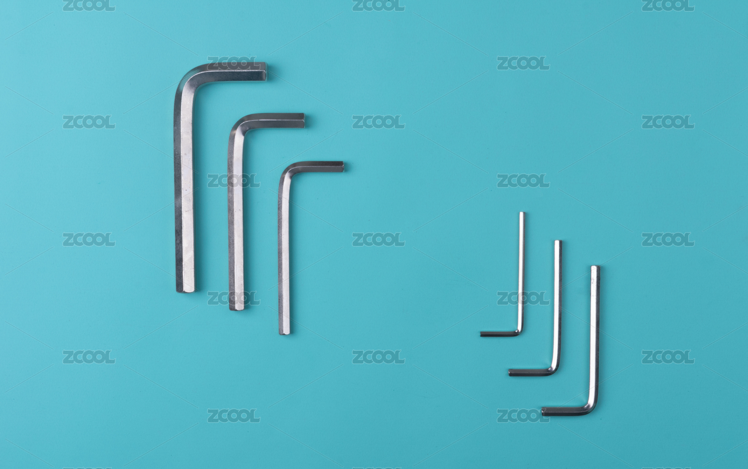 蓝色背景上金属内六角螺丝刀组成的括号符号