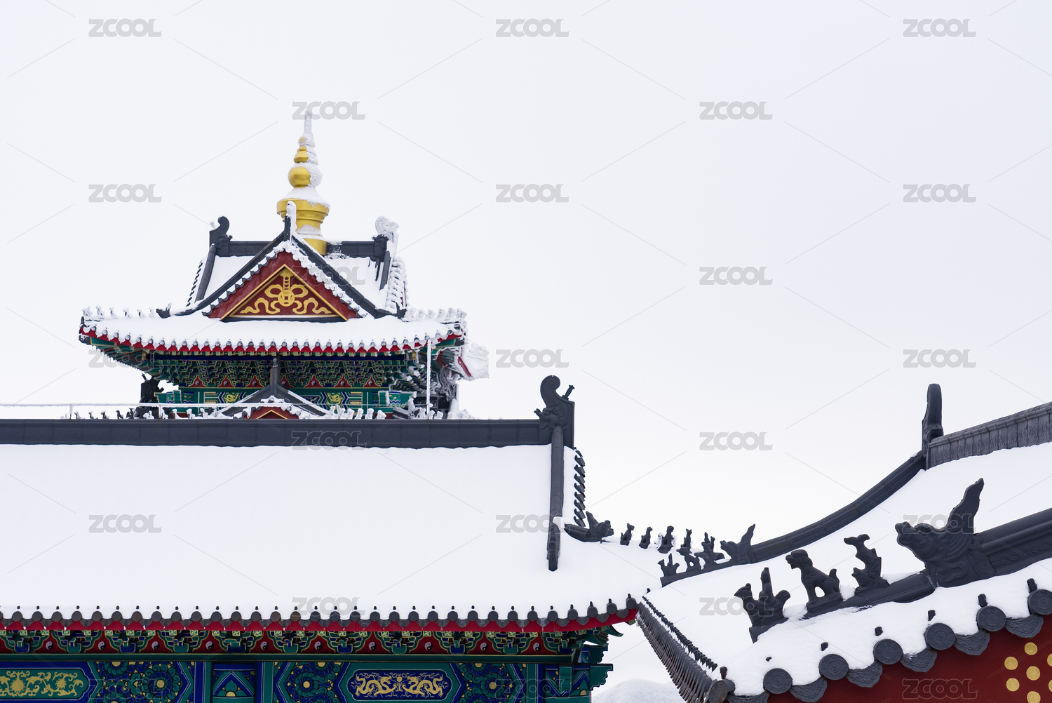 冬天寒冷大雪建筑历史屋檐彩绘旅游背景老君