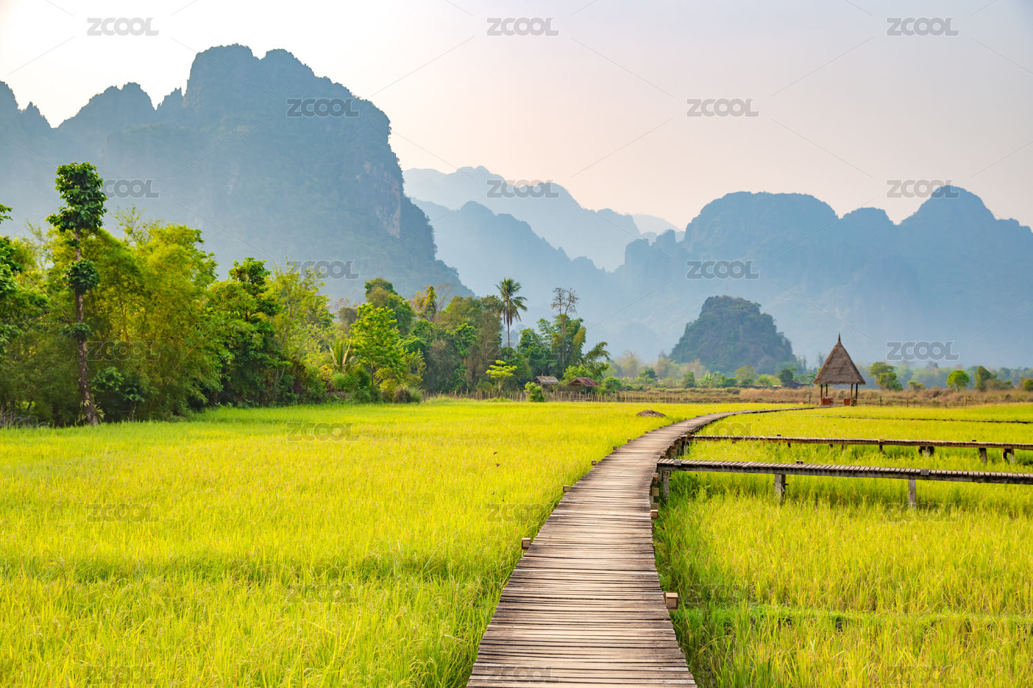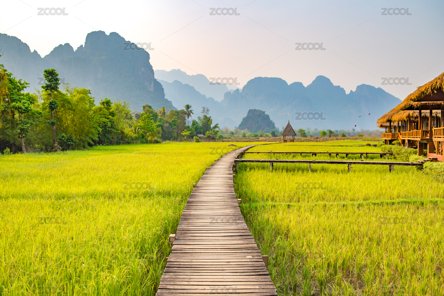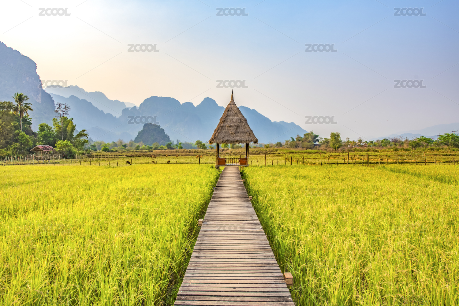 Golden Rice Paddy Field and Cottage Villas in Vang Vieng, Laos, Southeast Asia