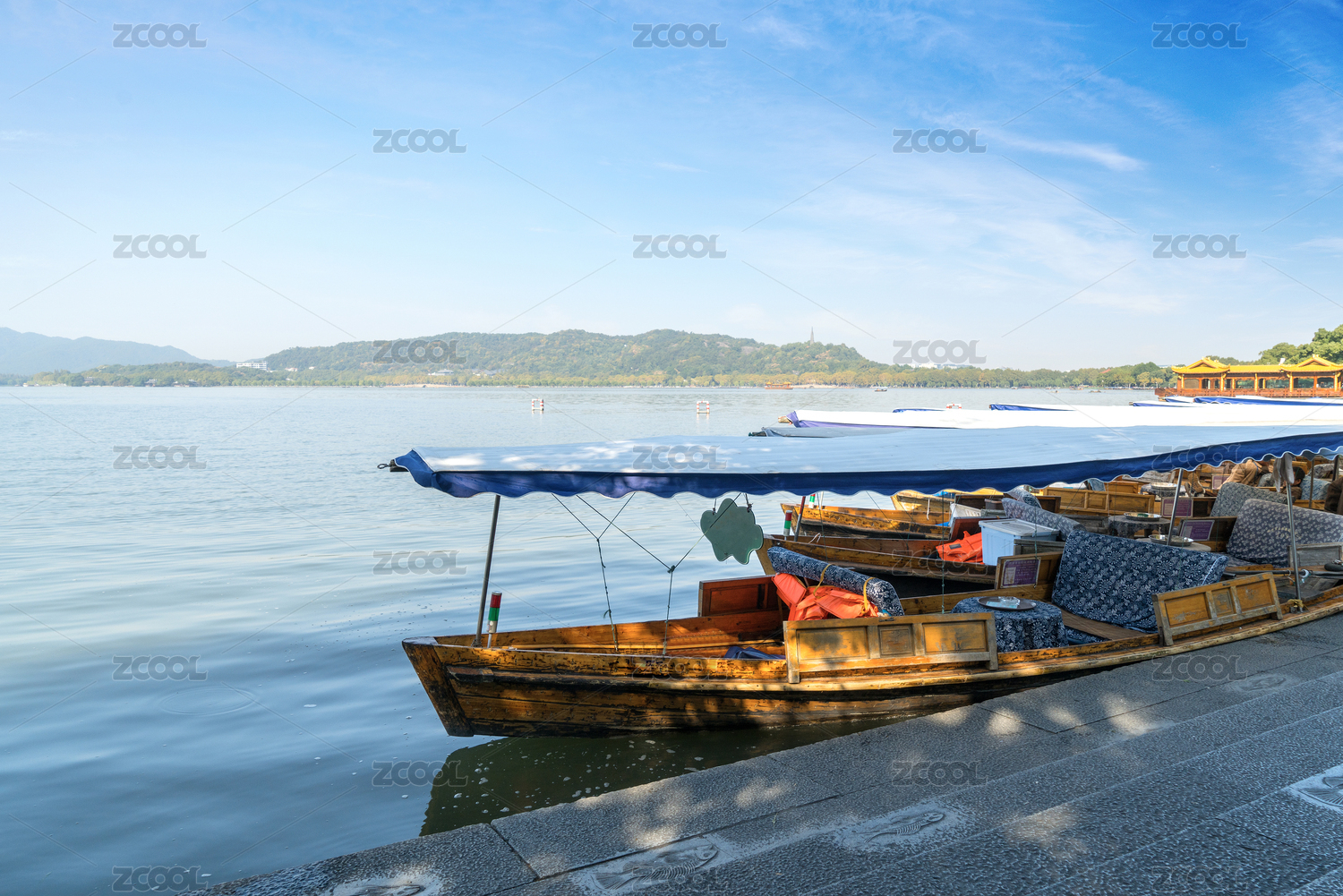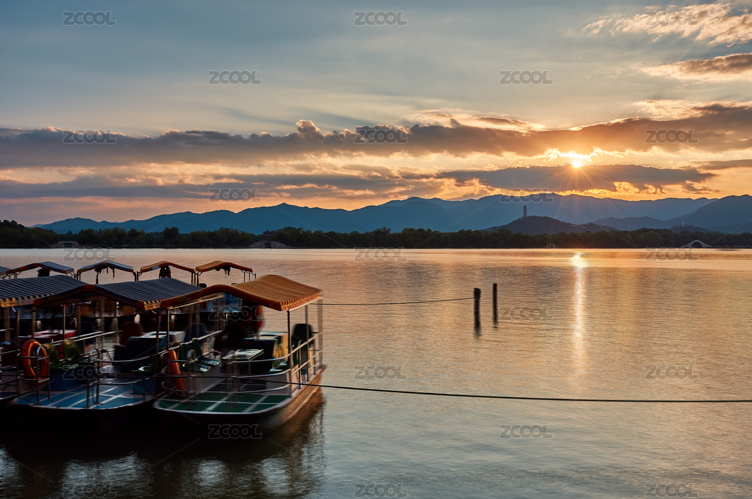 秋天夕阳下的北京颐和园公园的昆明湖旁的船