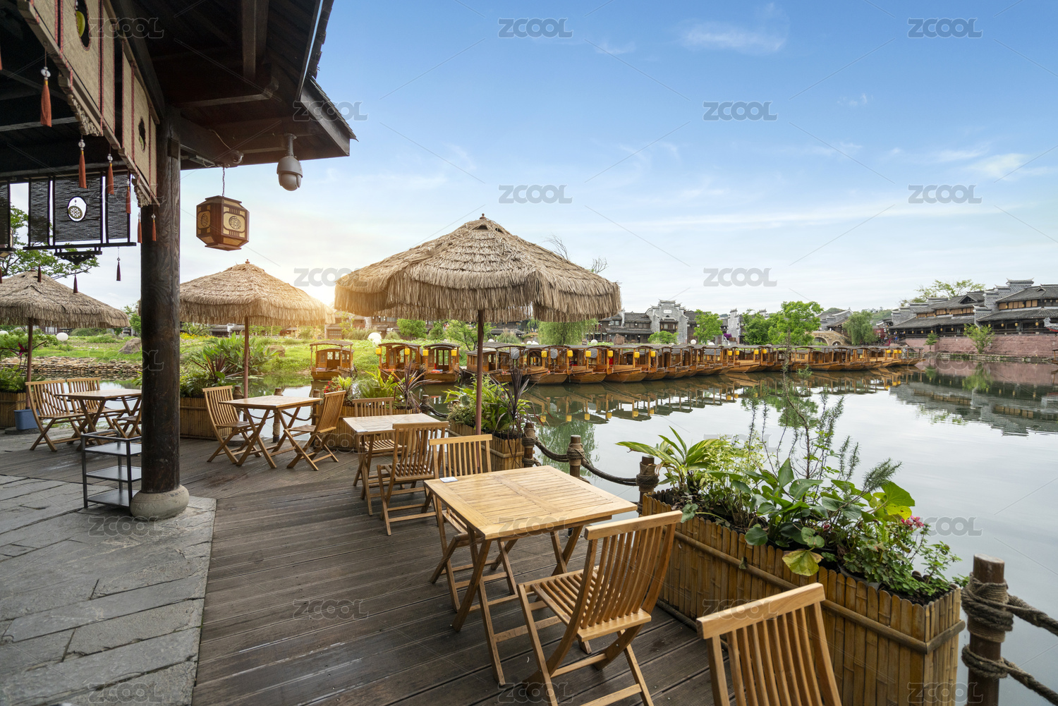 Dining Terrace with Beautiful Riverview at Blue Hours in Vang Vieng, Laos, Southeast Asia