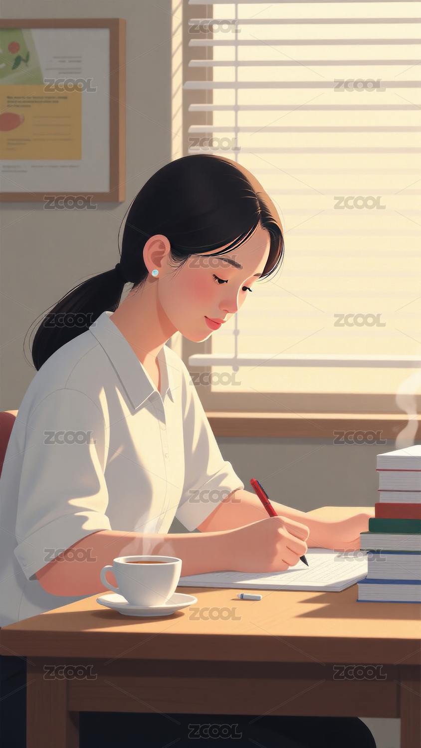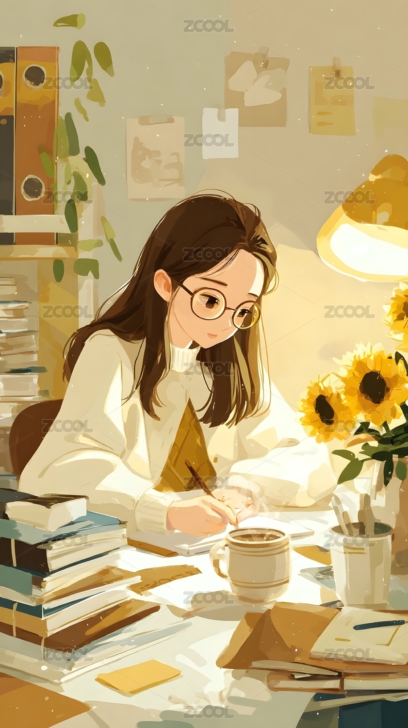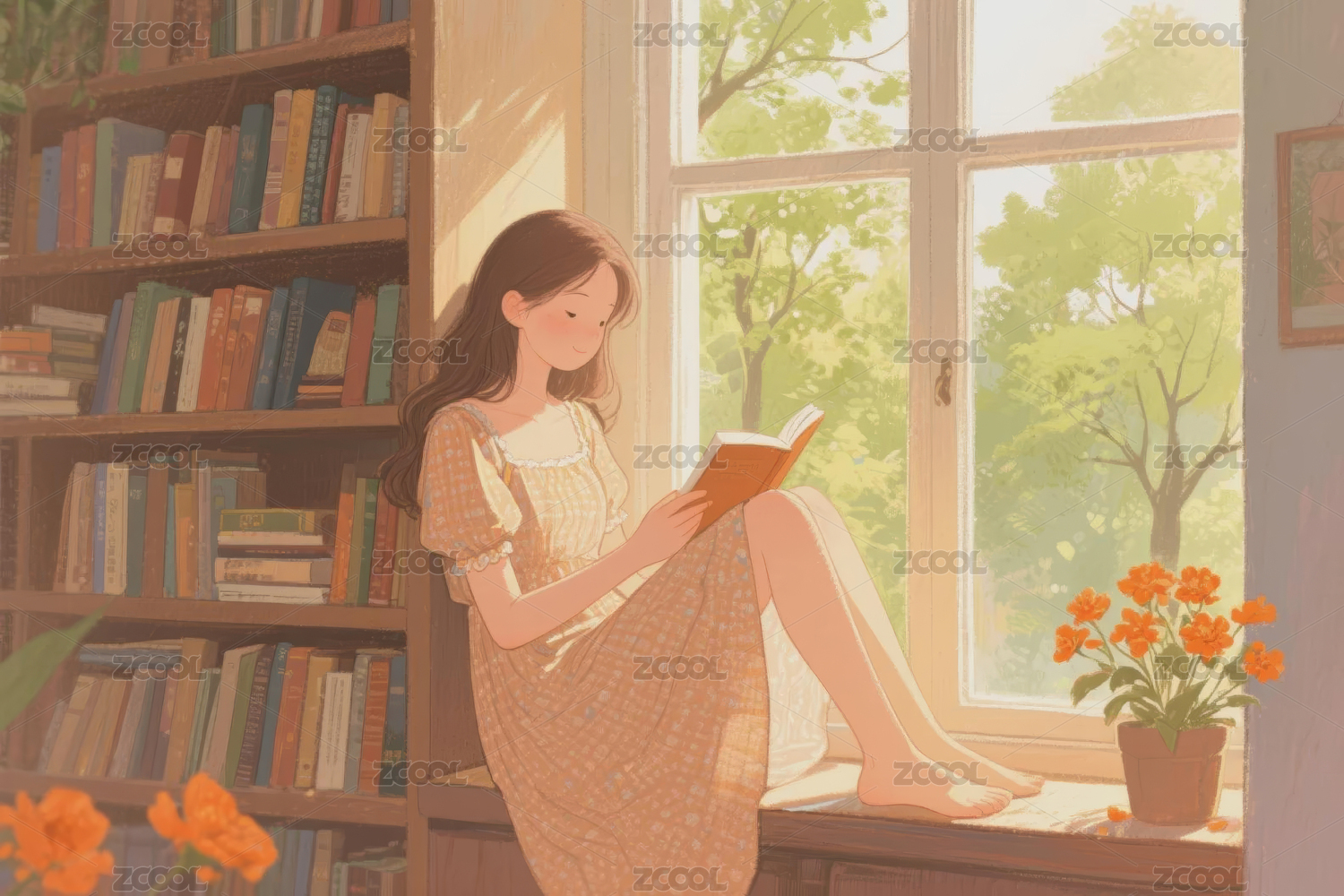 插画,女孩,室内,场景,黄色,毛衣,黄色调,温馨,窗户,书本