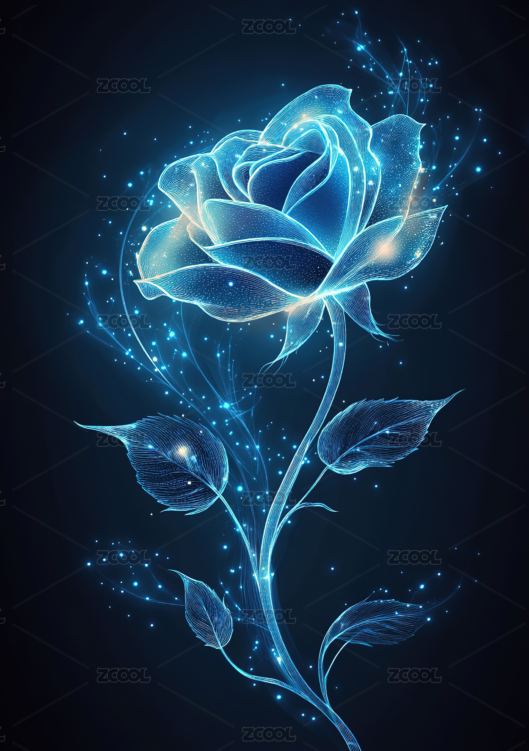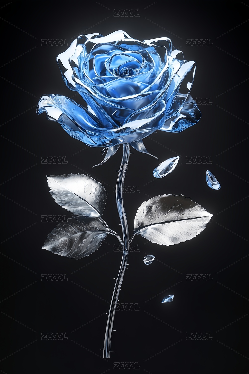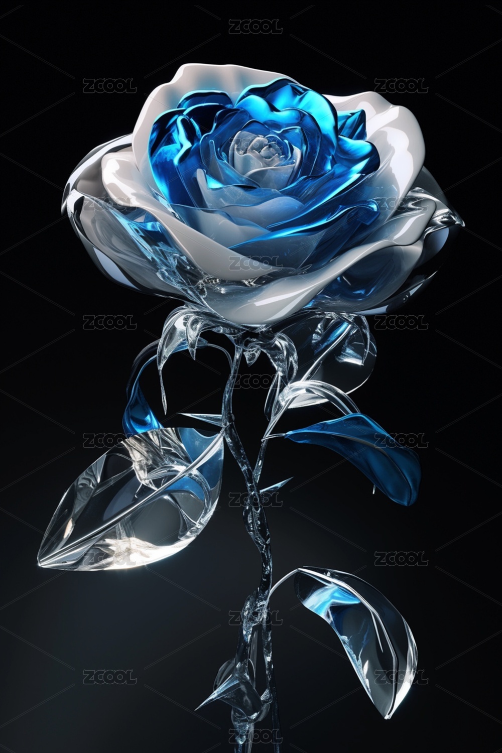 3D立体透明玻璃三维质感光感蓝玫瑰花