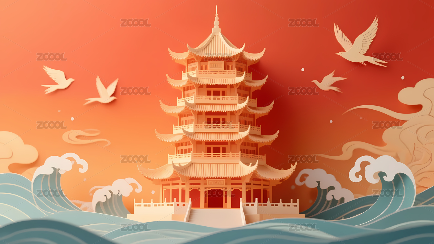 国潮建筑插画中国风黄鹤楼城市地标活动海报
