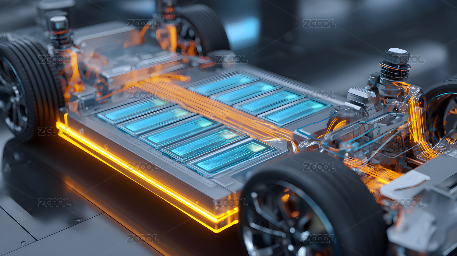 蓝色发光的电动汽车底盘结构
