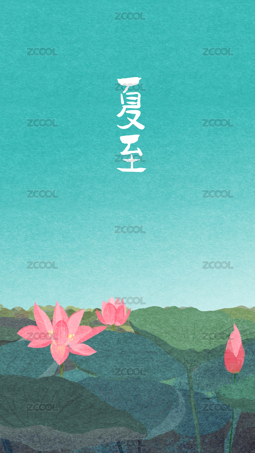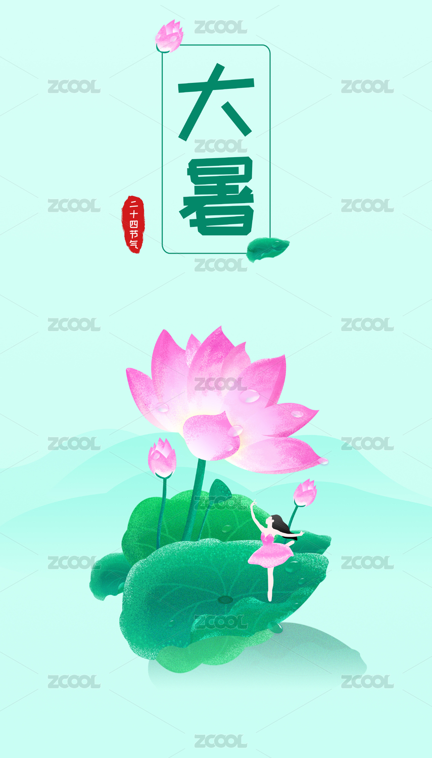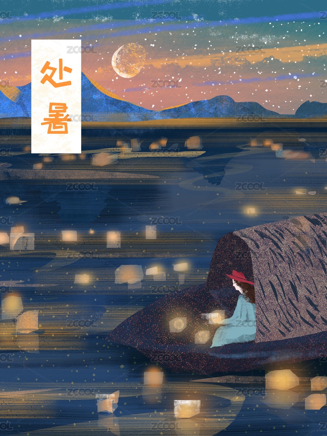 插画处暑女孩河边荷叶节气季节花夕阳小清新