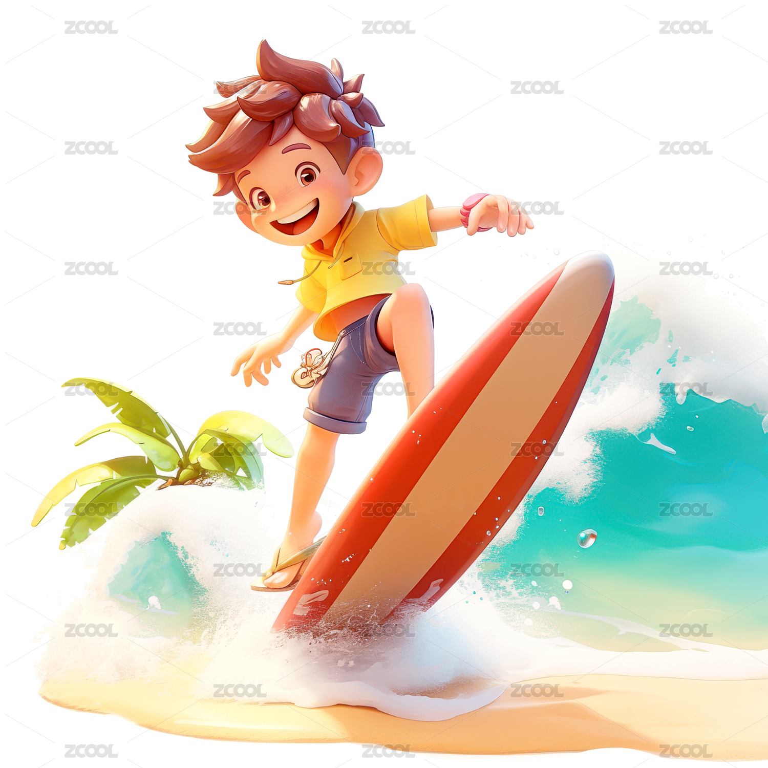卡通插画风格的儿童在游泳池中玩耍,展现夏