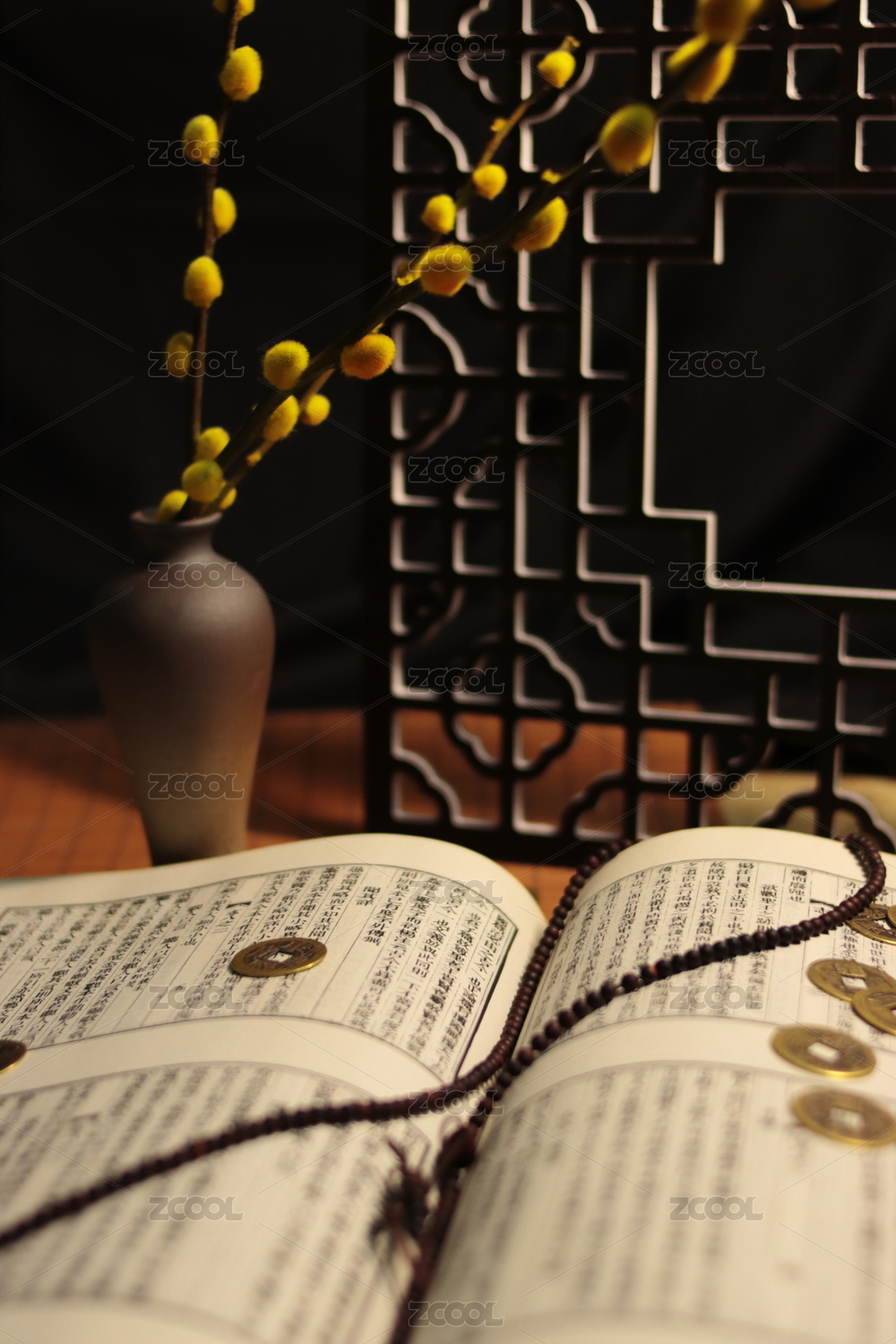 书本,中式,古籍,铜钱,手串,中式插花,特写,室内,摆拍,古典