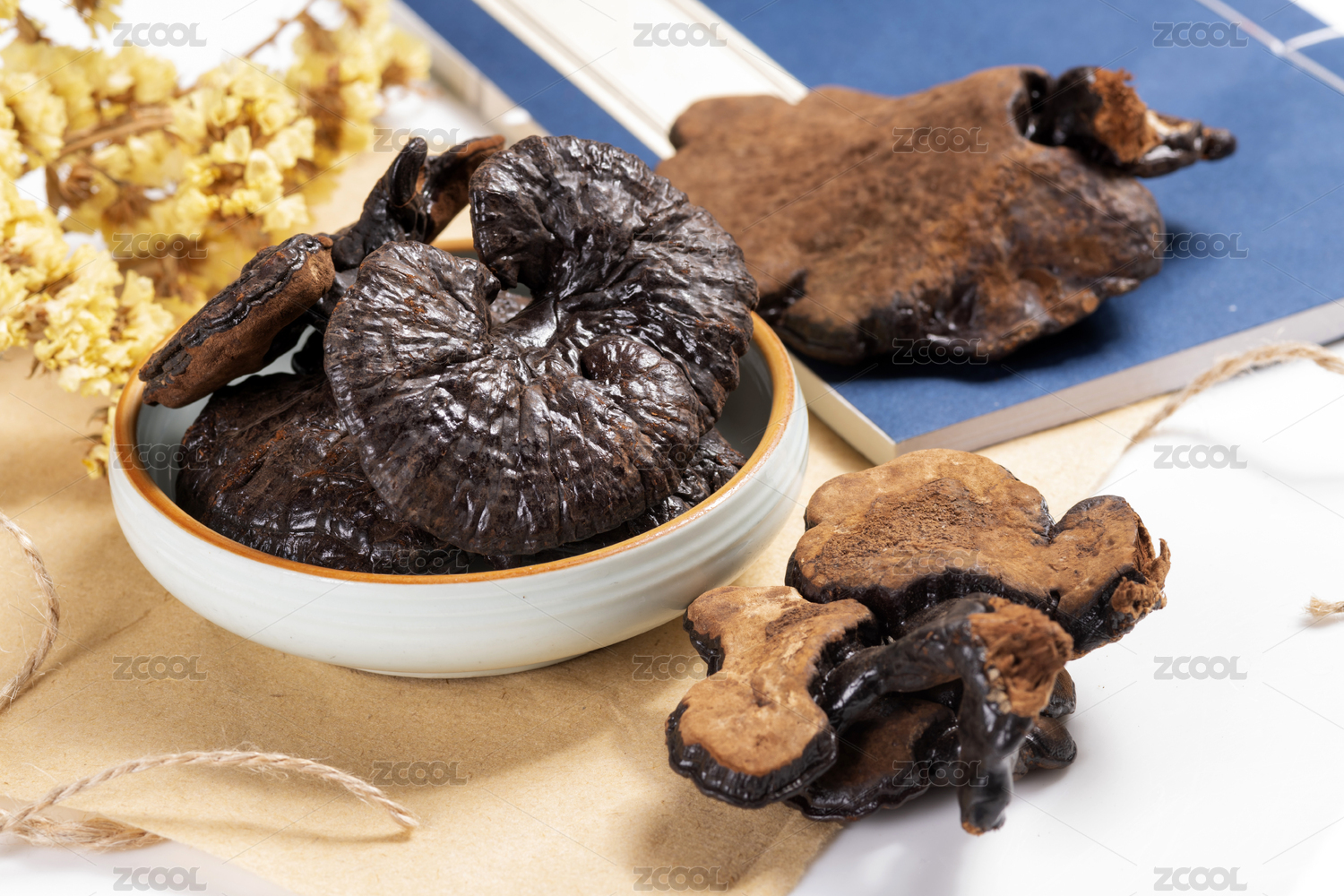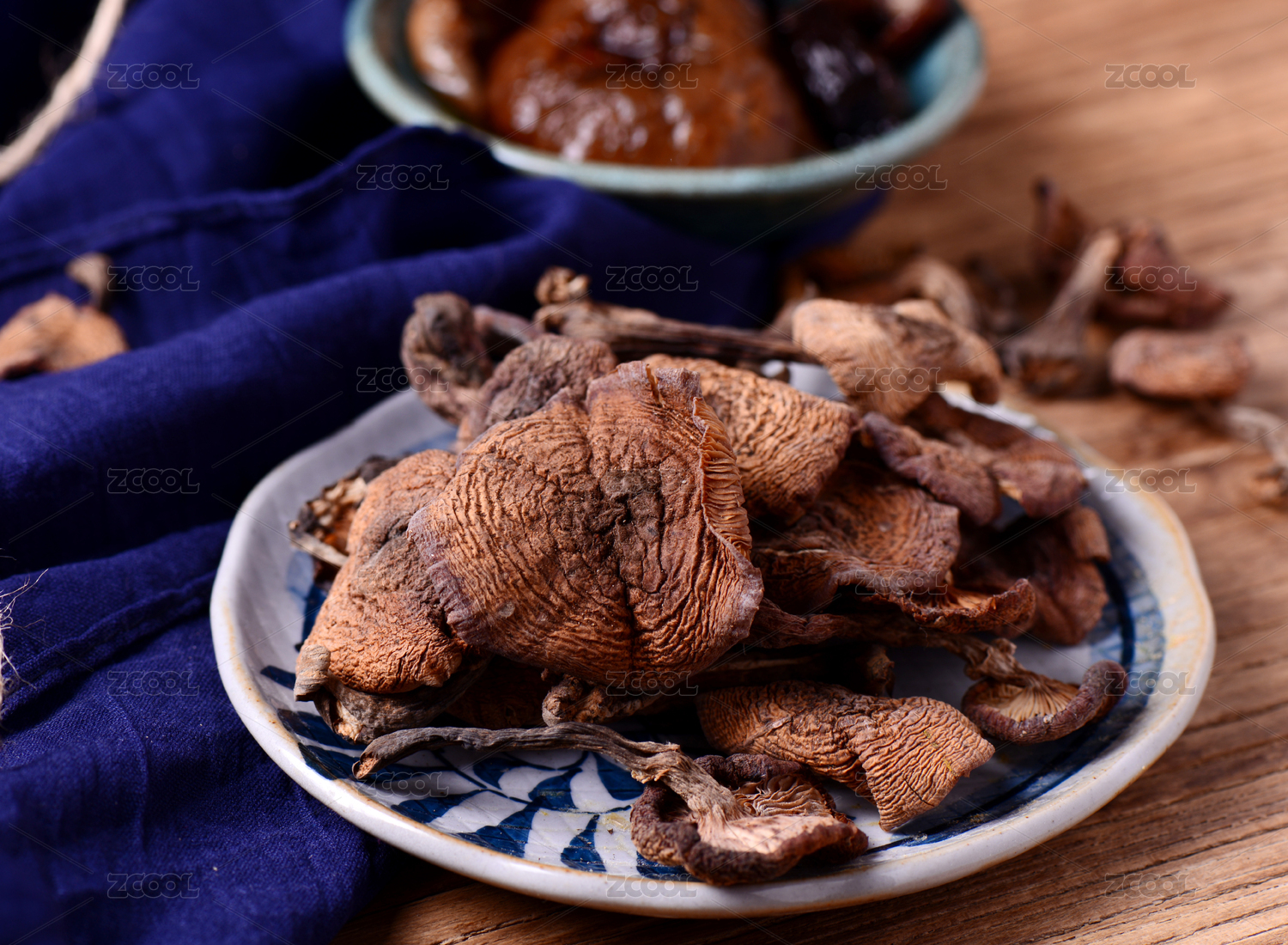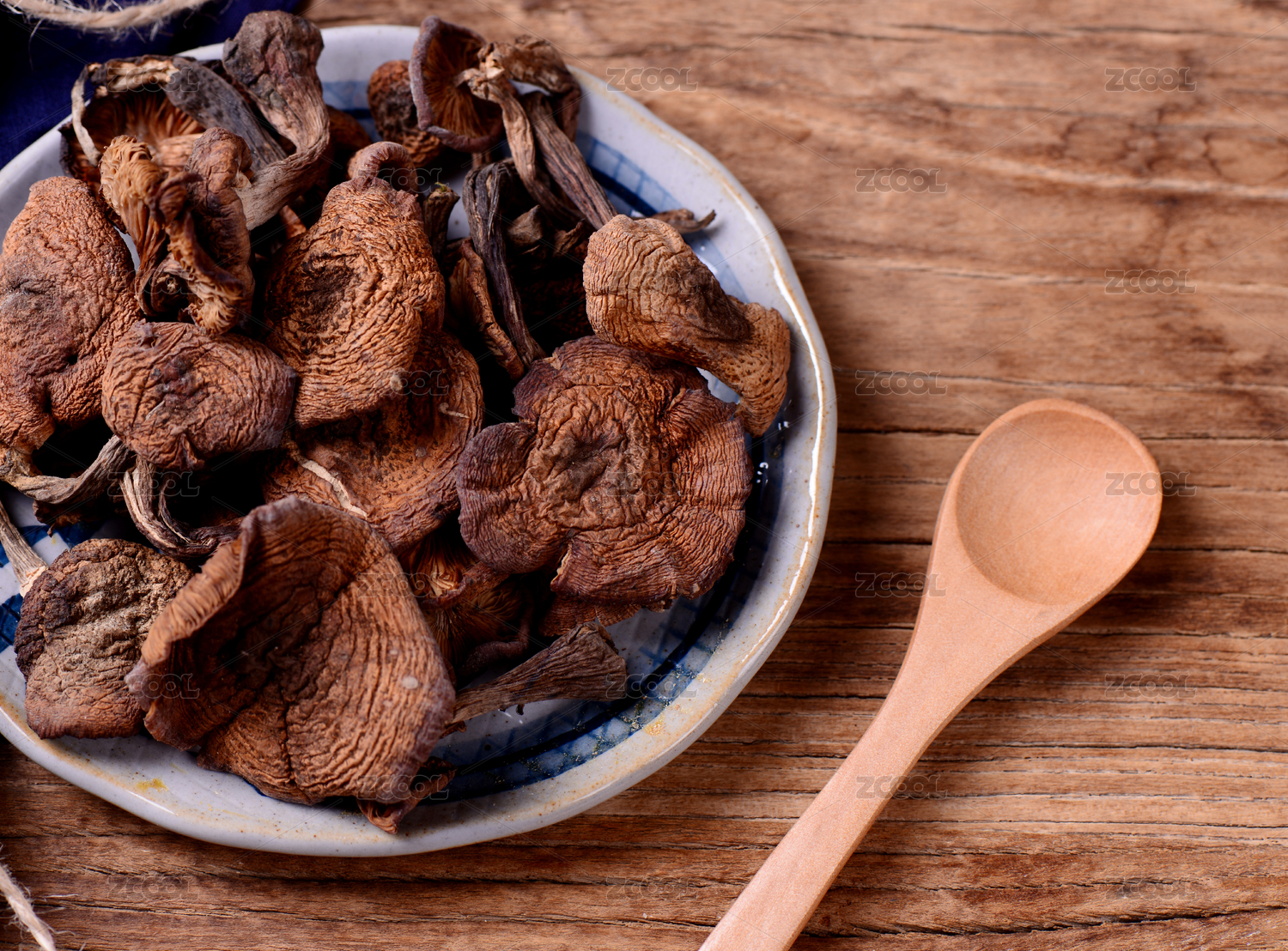 木纹背景上餐具里盛放的榛蘑菌菇干