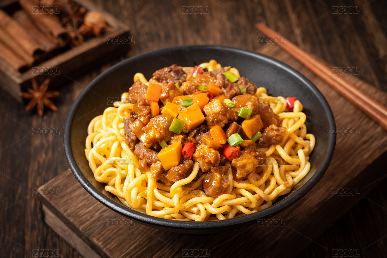 暗色桌子上的牛肉拌面