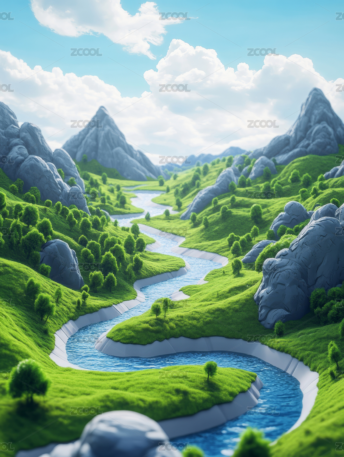 航拍视角蜿蜒的河流绿色的山脉3D插画