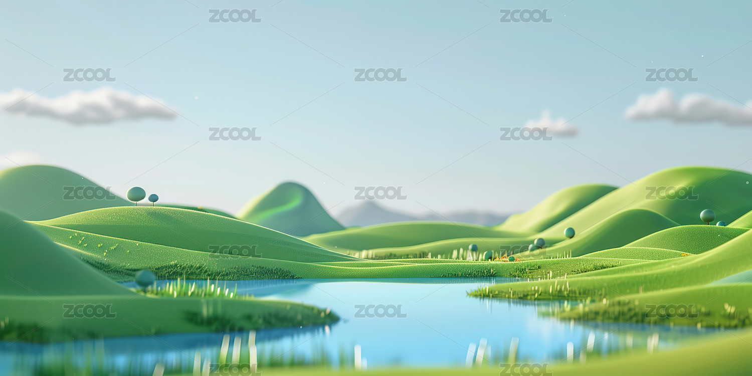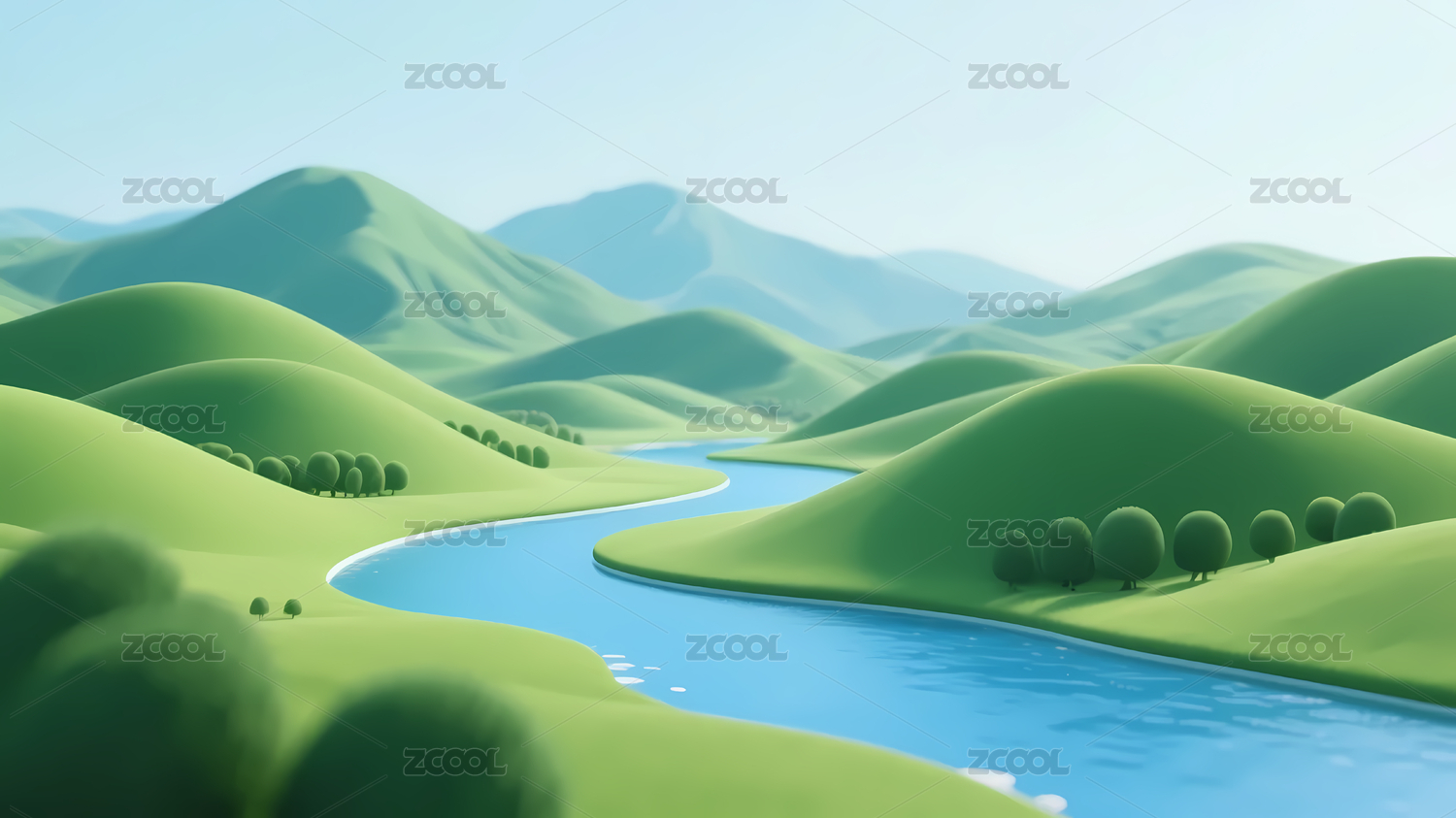 绿色的大堤中间蜿蜒的河流风景3D卡通插画