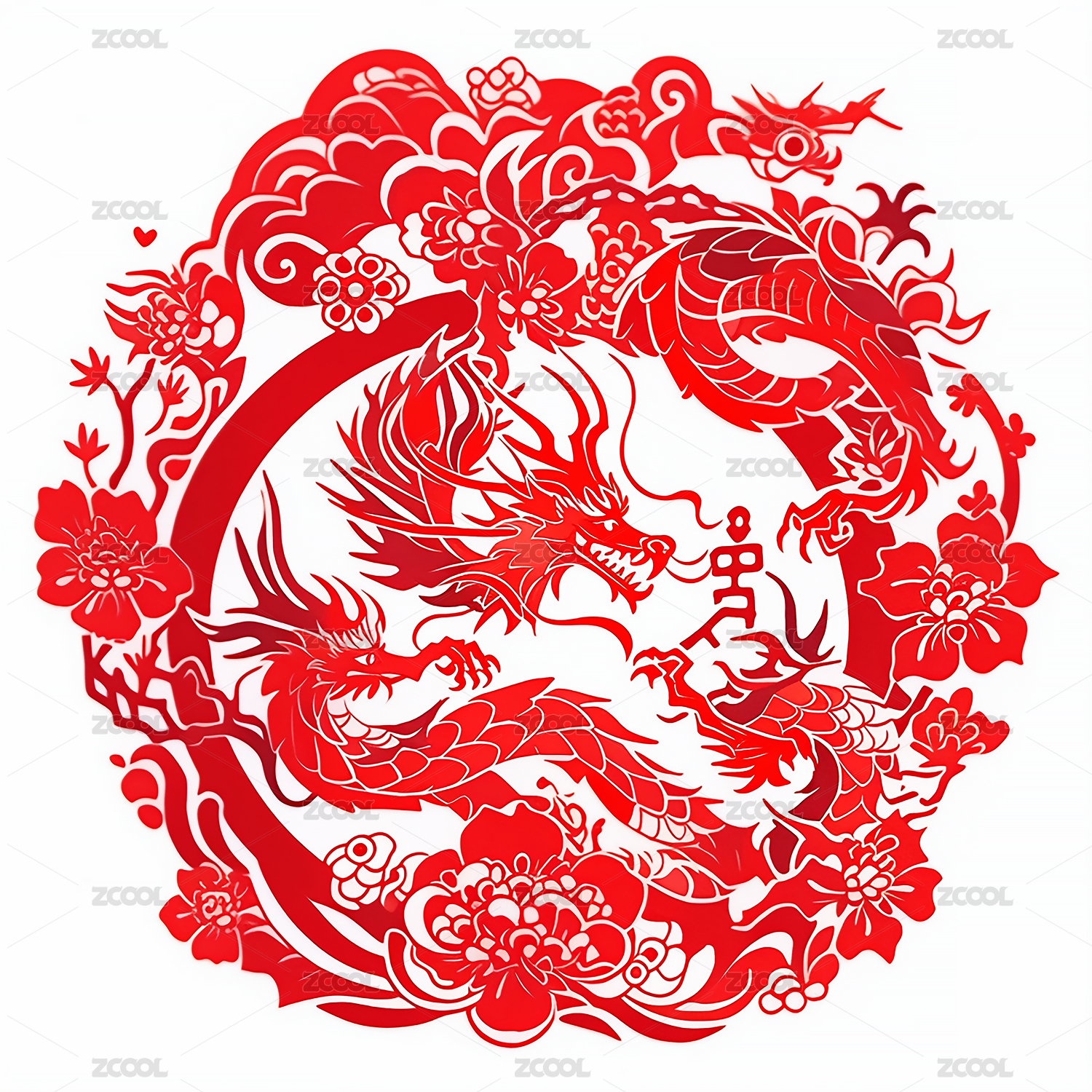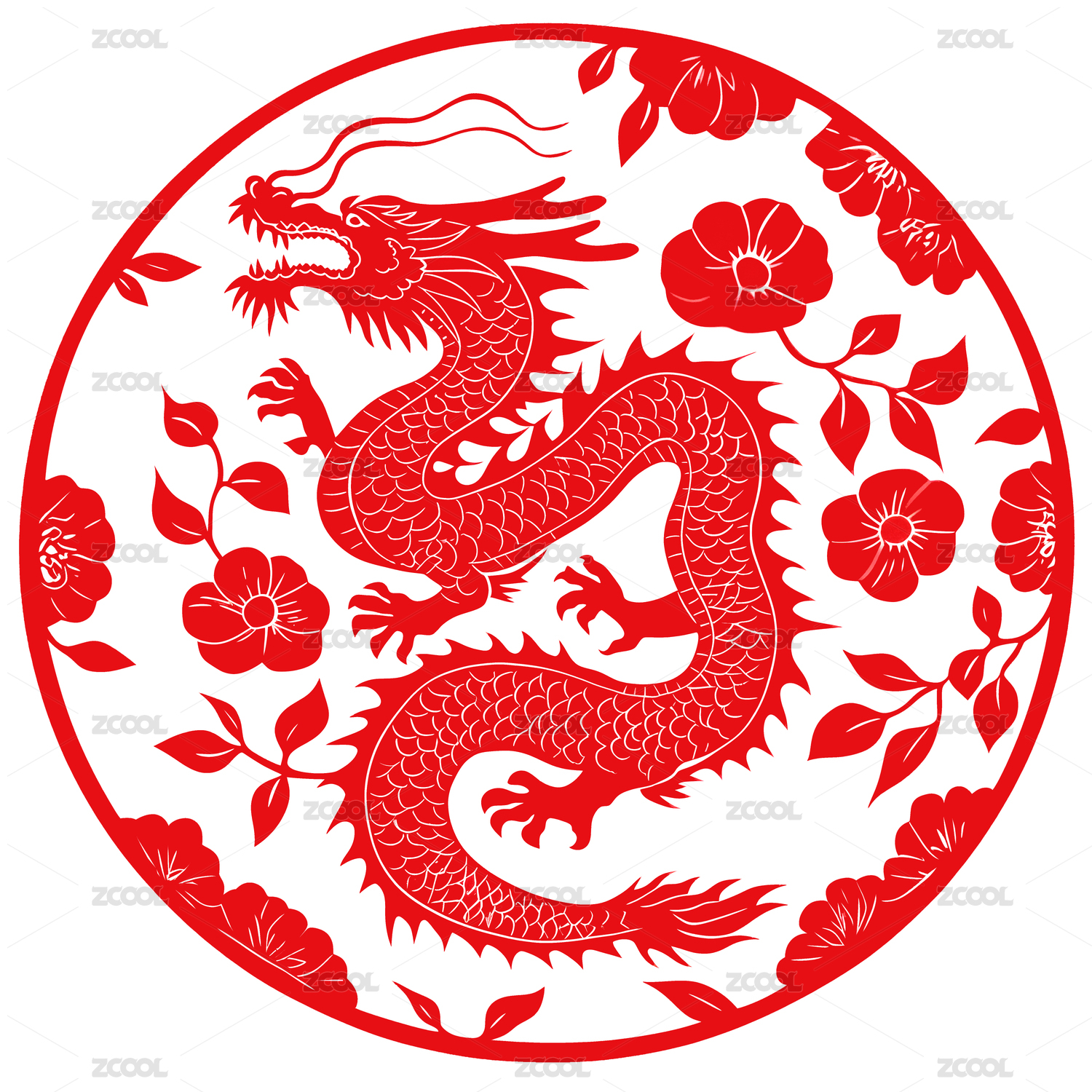 龙年春节十二生肖红色圆形剪纸元素