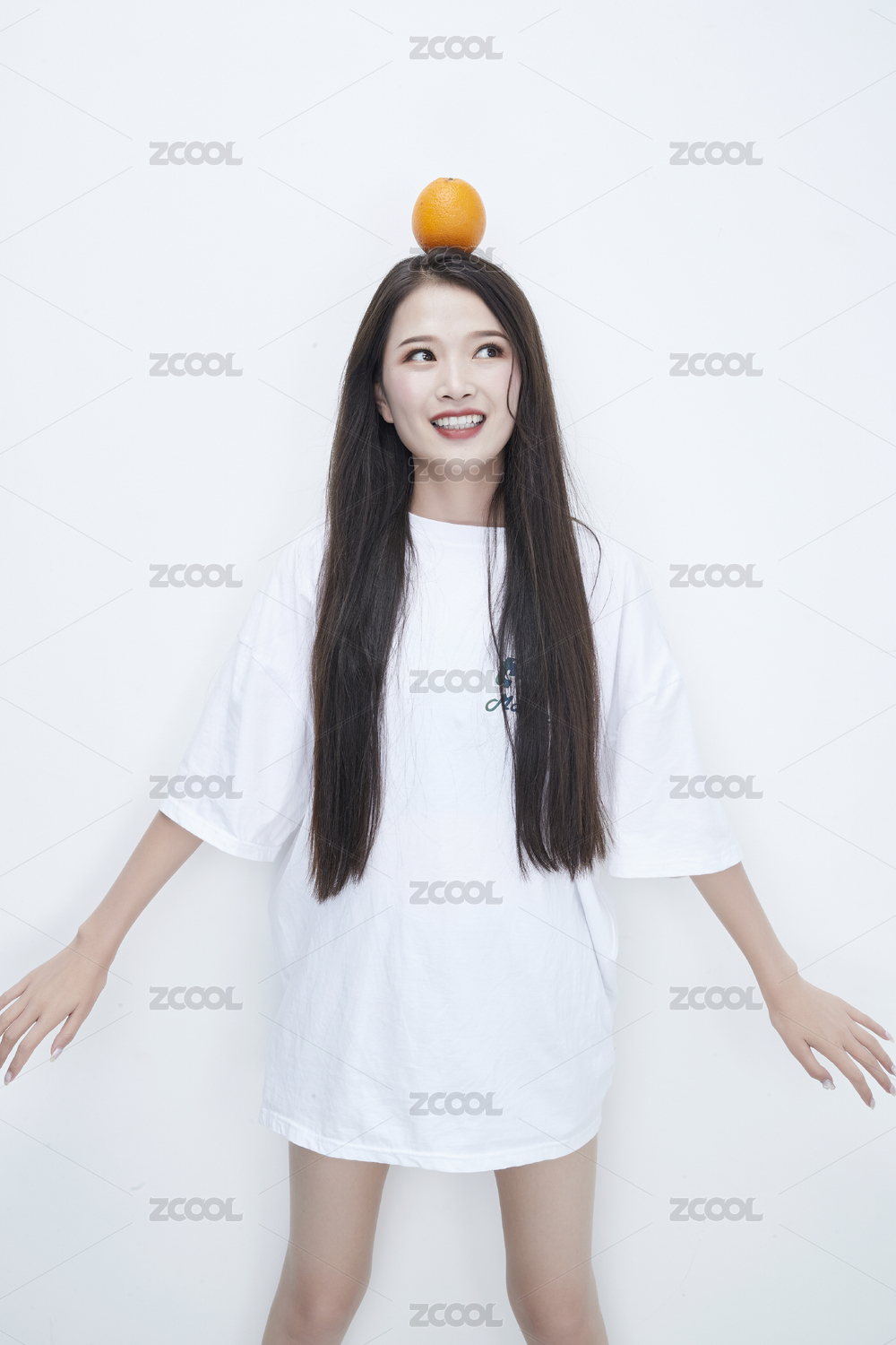 头顶橙子穿白色长T血的亚洲可爱少女人像