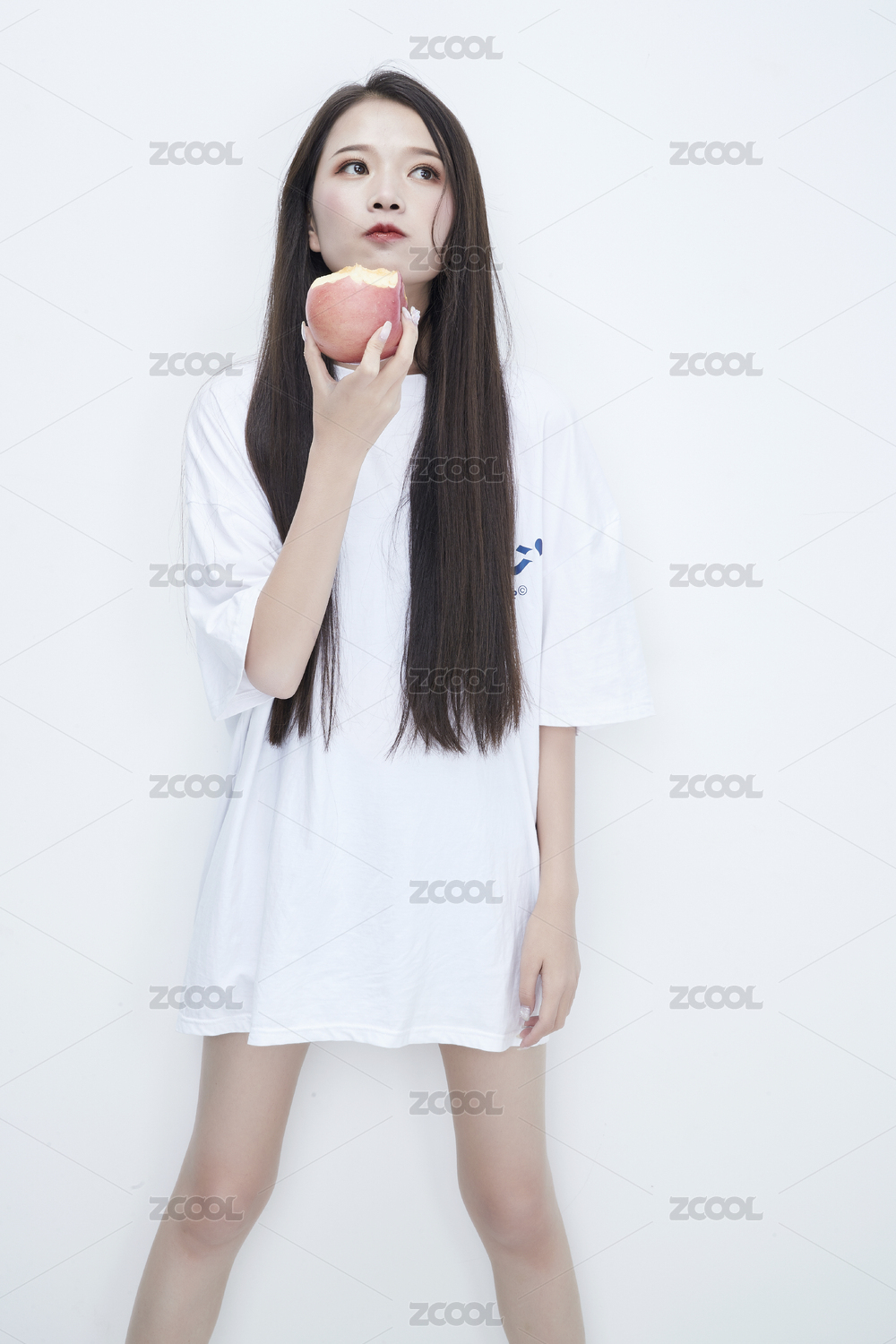 吃苹果的穿白色长T血衫的长发可爱少女人像