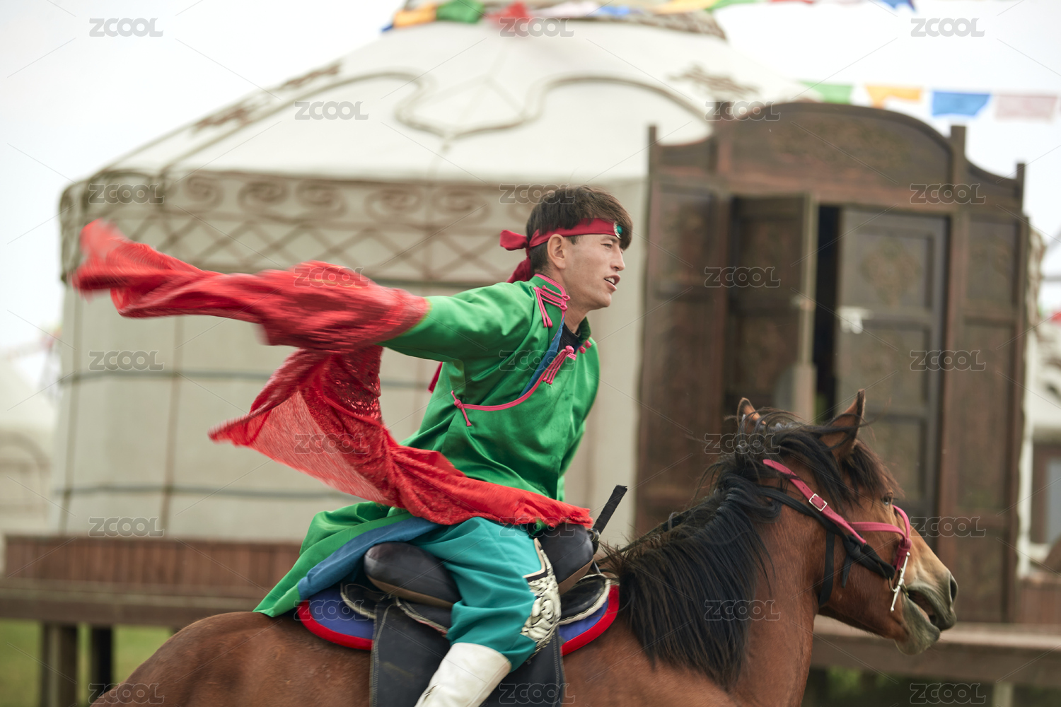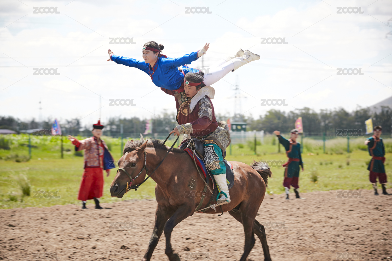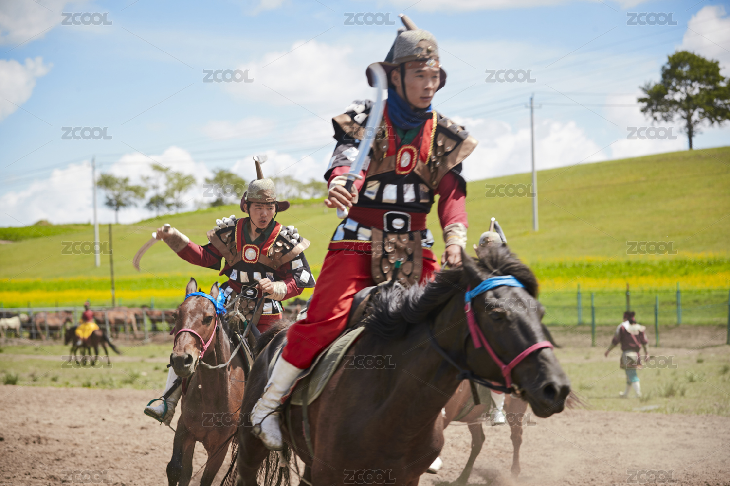 草原那达慕大会上骑着马的蒙古演员