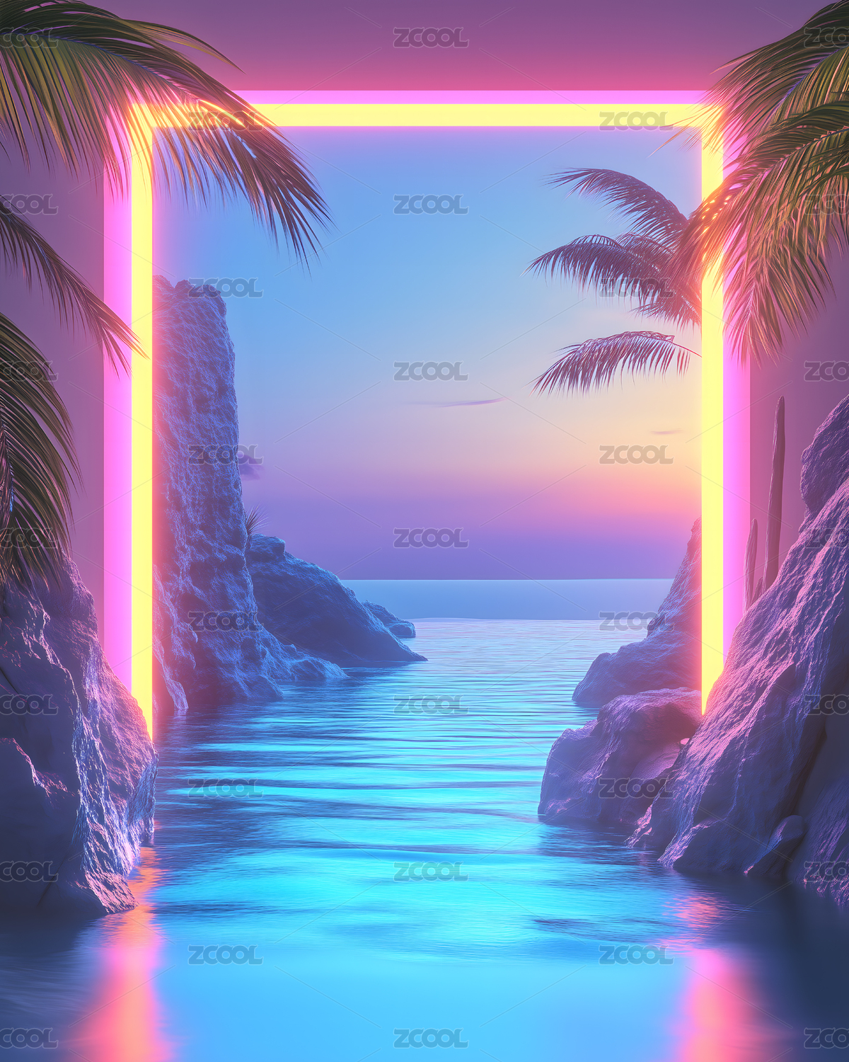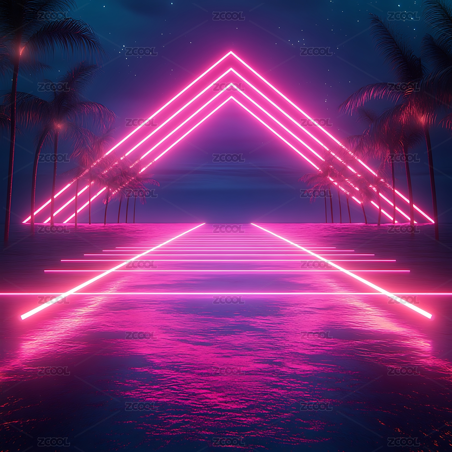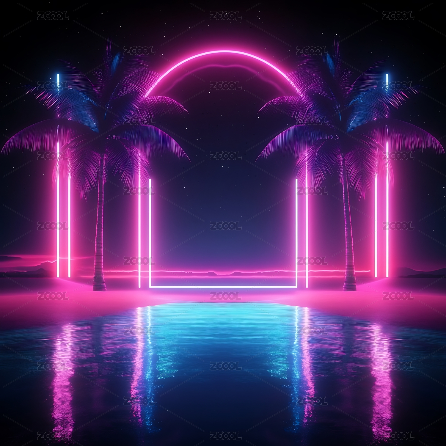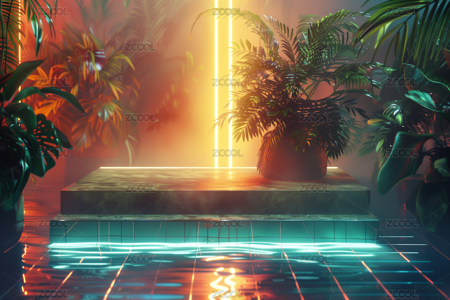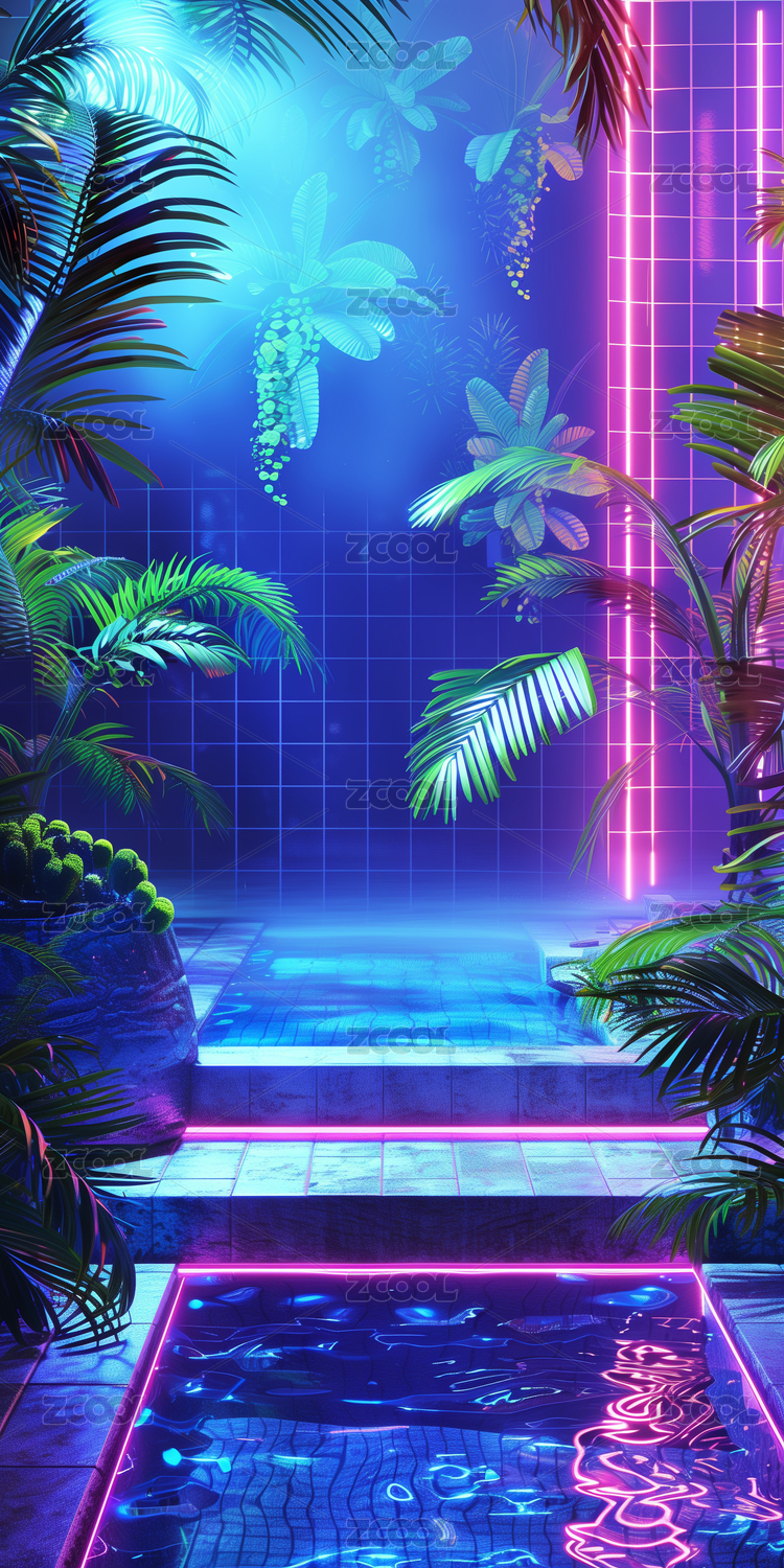 科幻,赛博朋克,游泳池,水池,展台,热带植物,霓虹灯,激光,射灯,霓虹