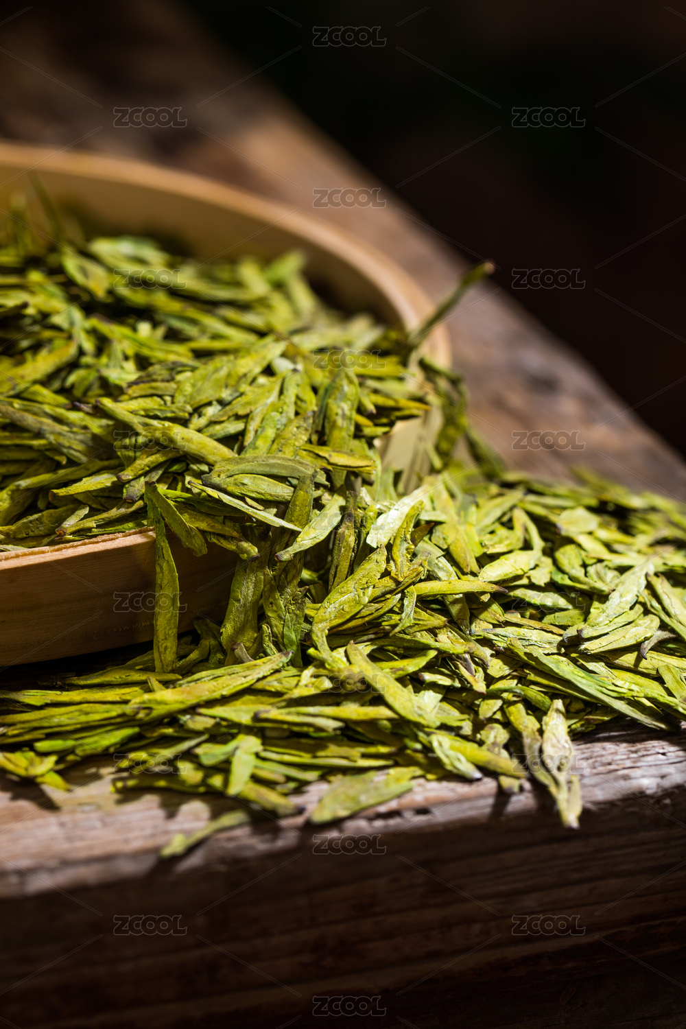 装有龙井茶的黑色茶杯倾倒使龙井干茶叶洒落