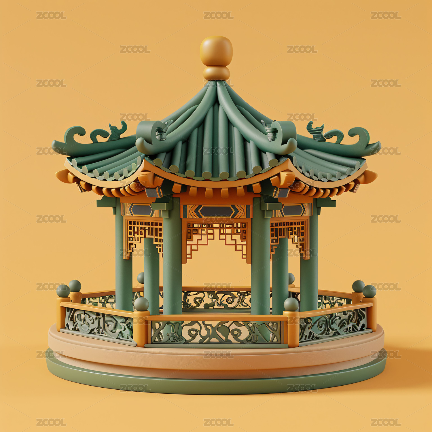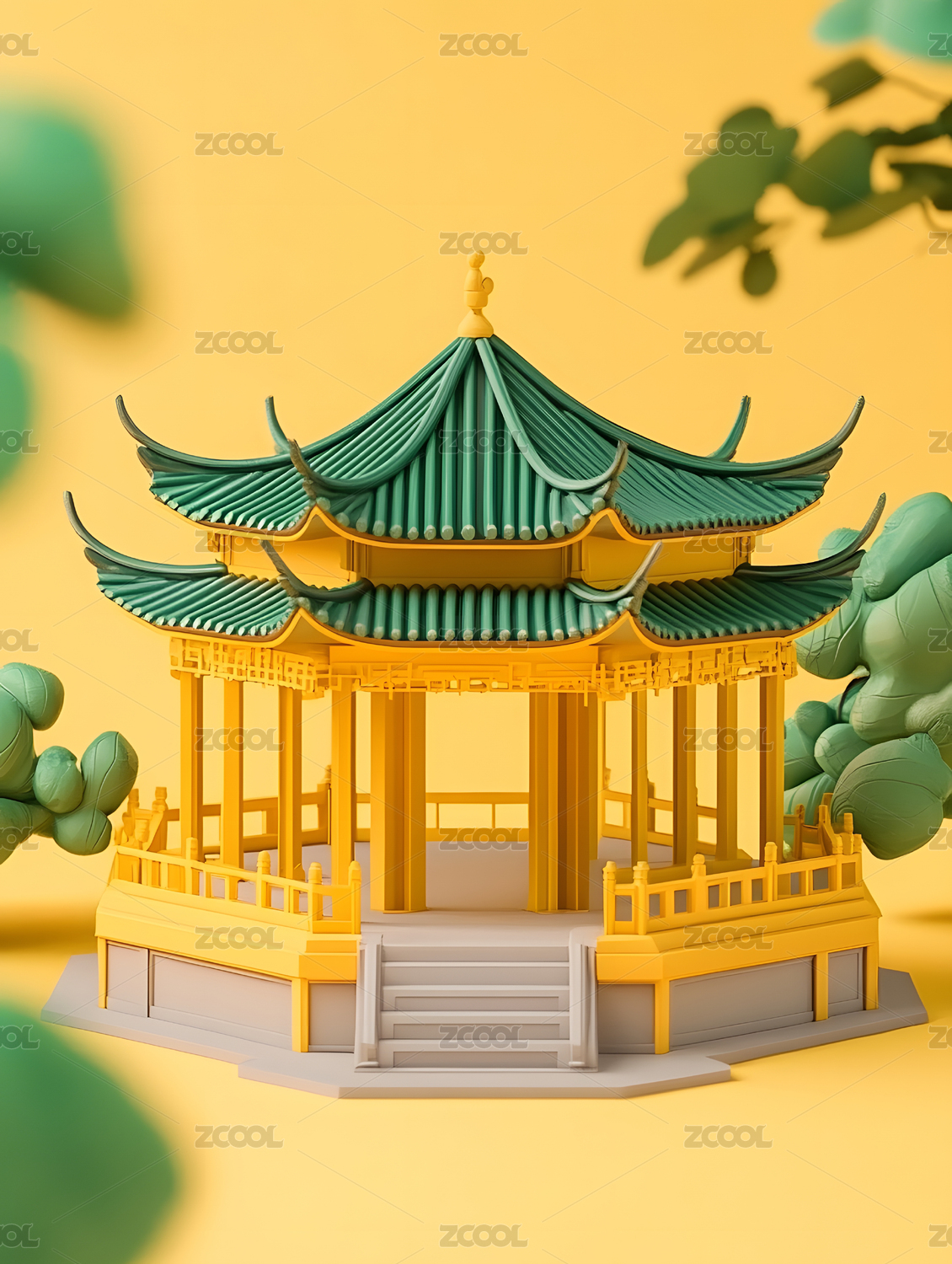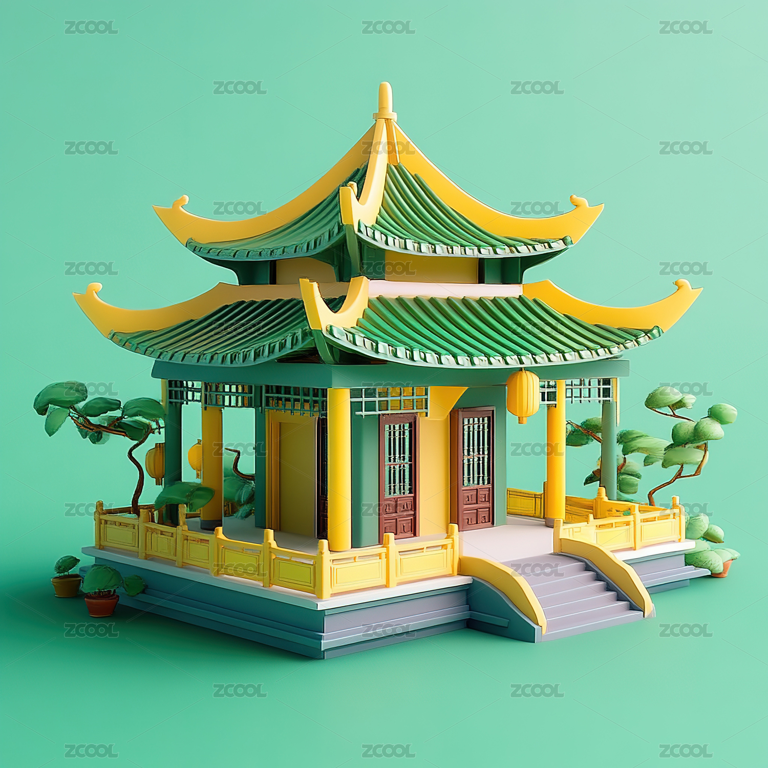 3D渲染的中国风古建筑插画,琉璃材质中式