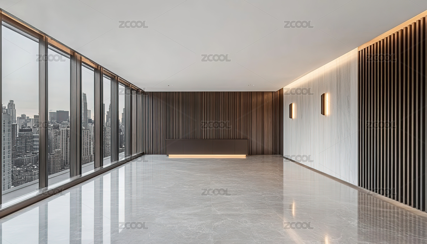 宽敞现代室内空间大窗与城市景观