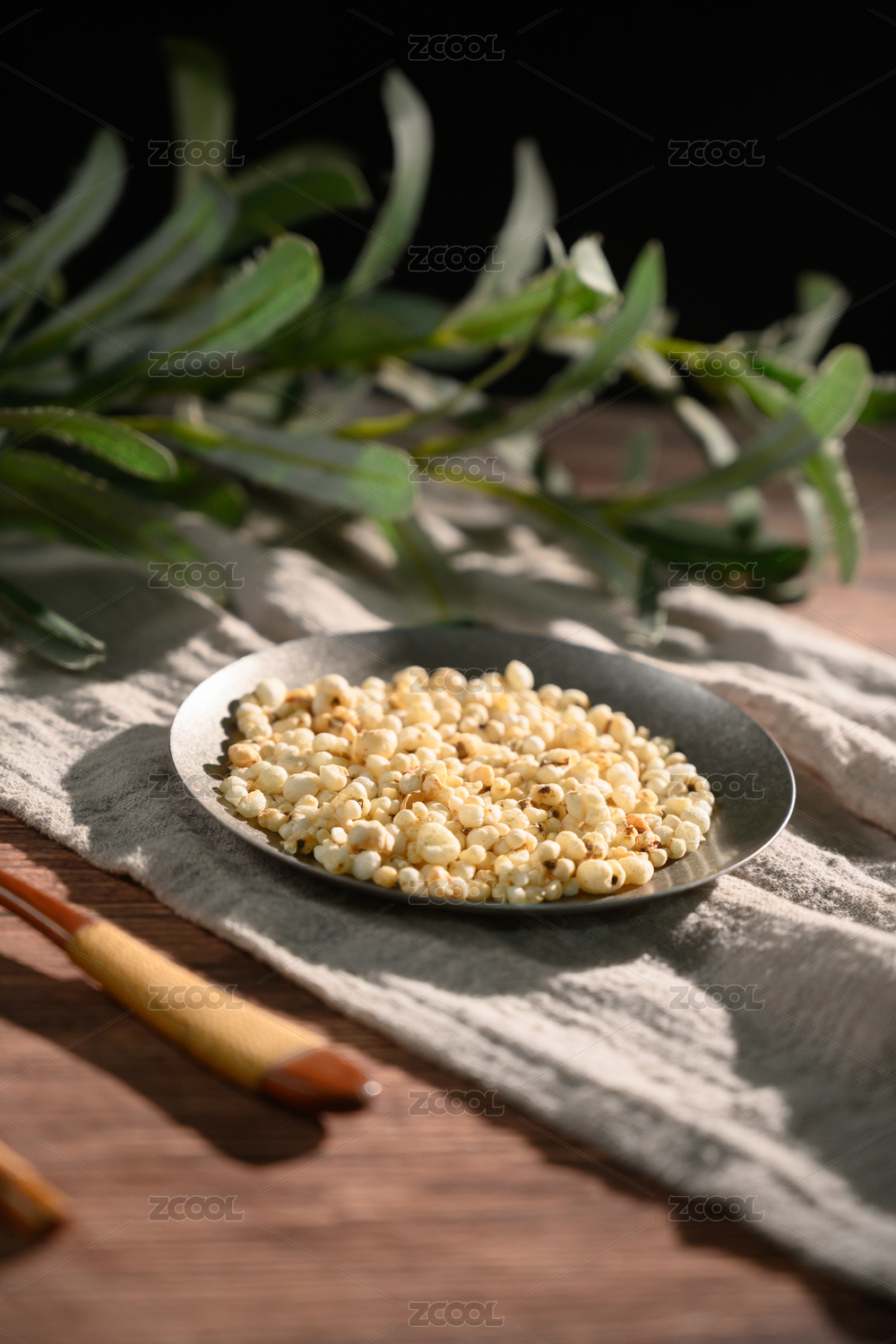 桌面上的盘子里的美味可口的薏米花