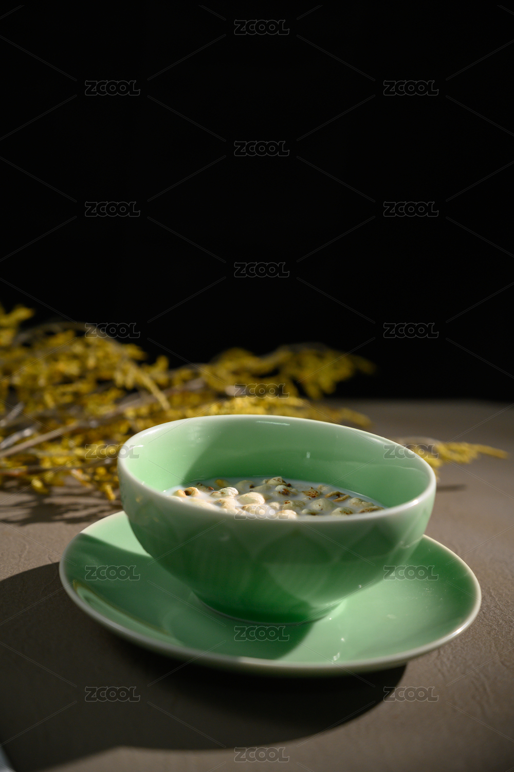 桌面上的碗里的美味可口的牛奶薏米花
