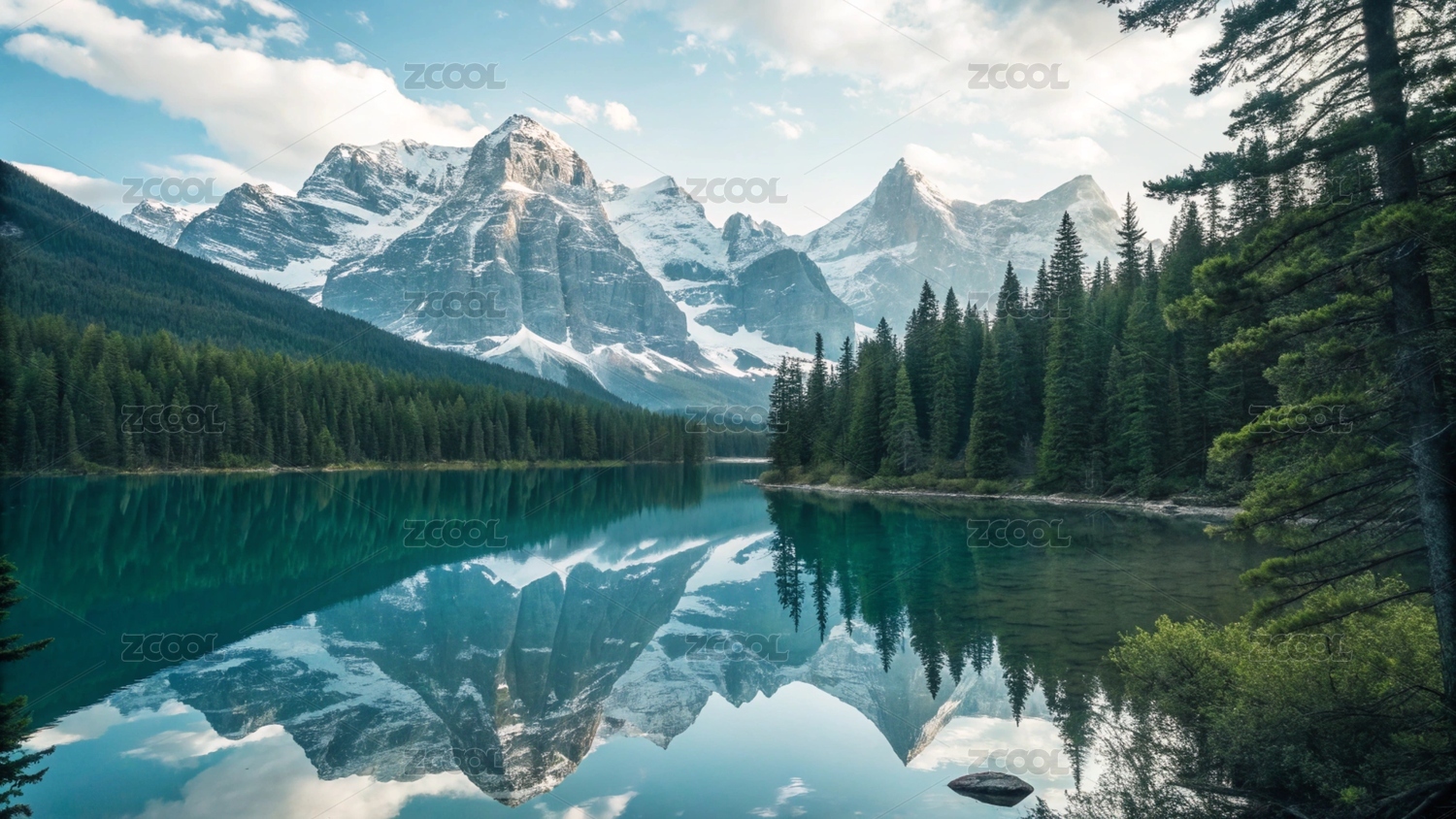 雪山和森林湖泊自然风光高清图片