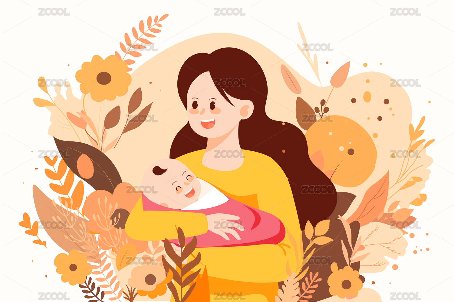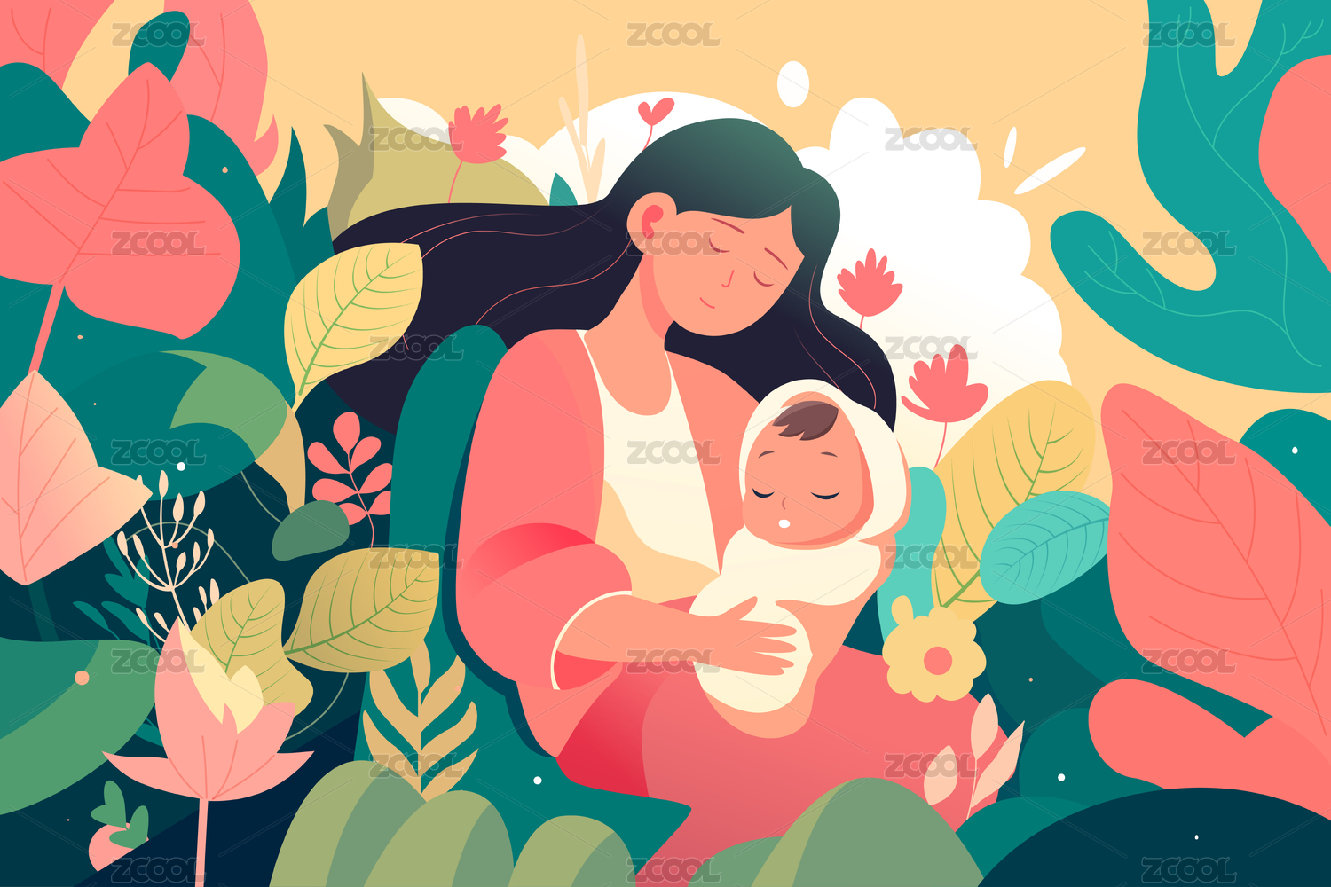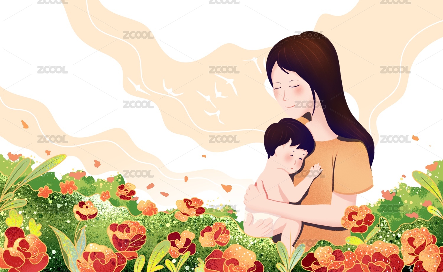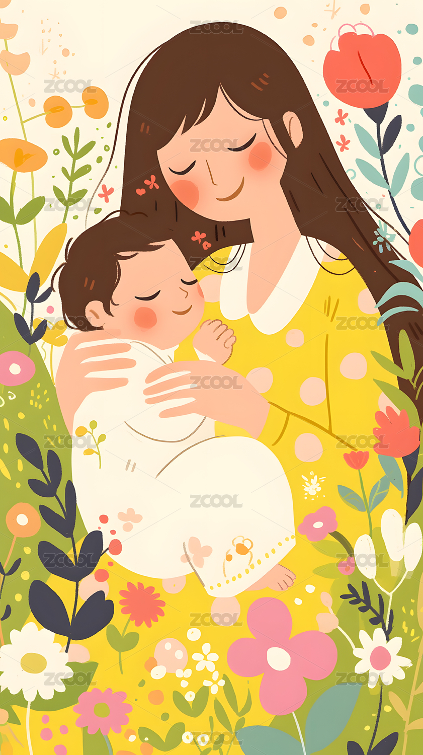 花丛中妈妈抱着孩子插画