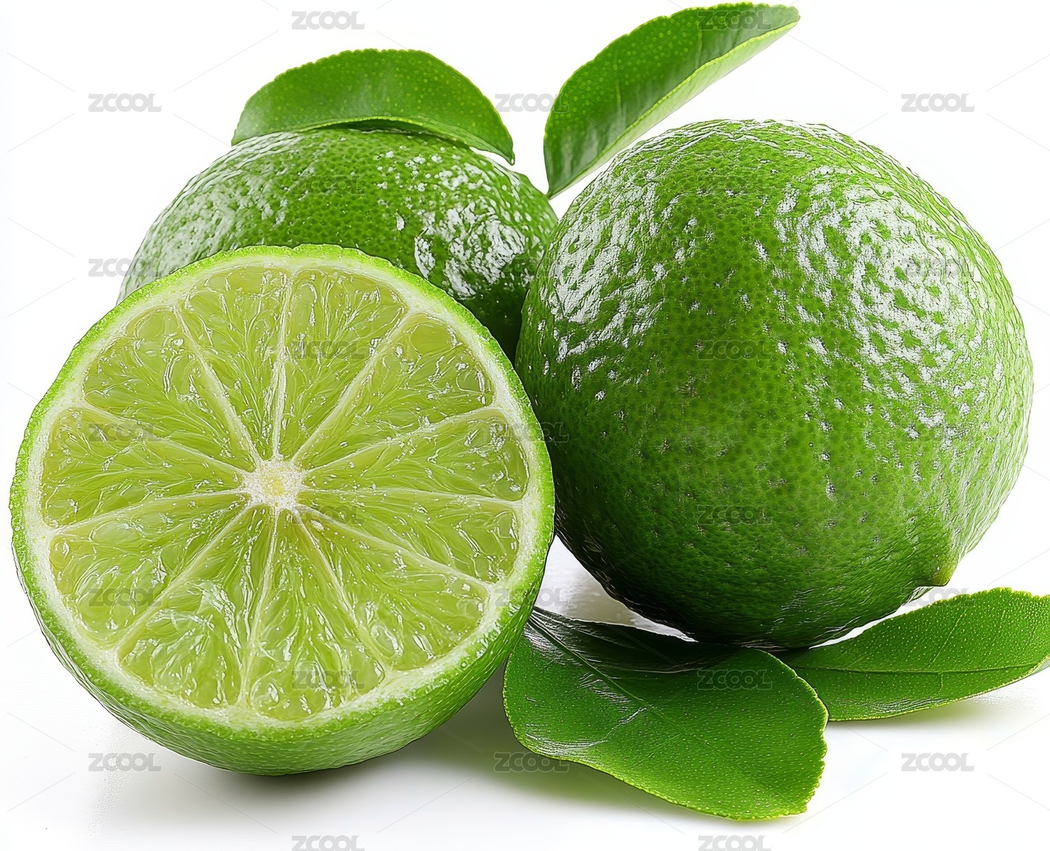 白底上放着一堆新鲜青柠檬和青柠檬果肉