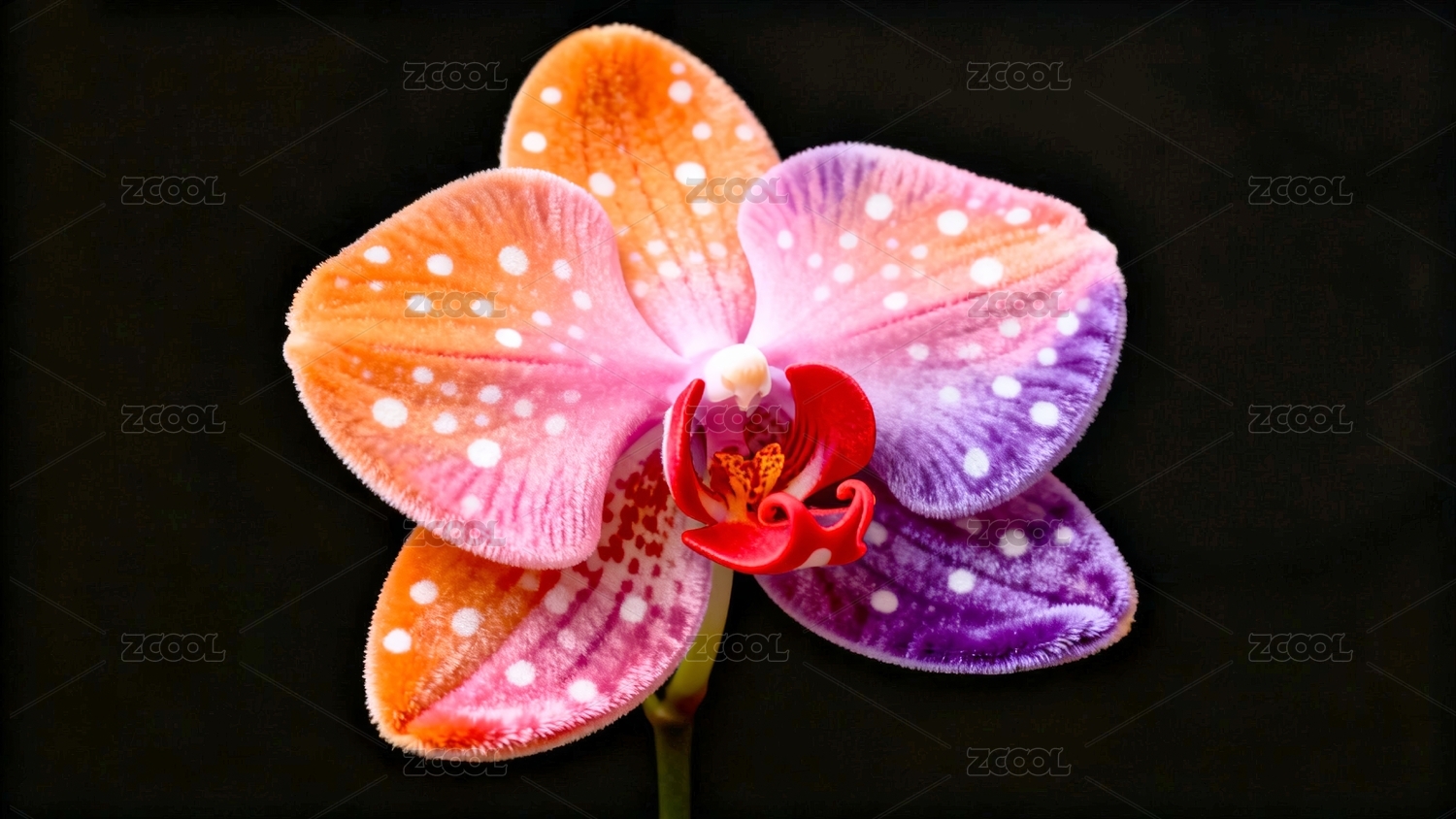 一簇紫红色小花蝴蝶兰在黑背景前的侧光特写