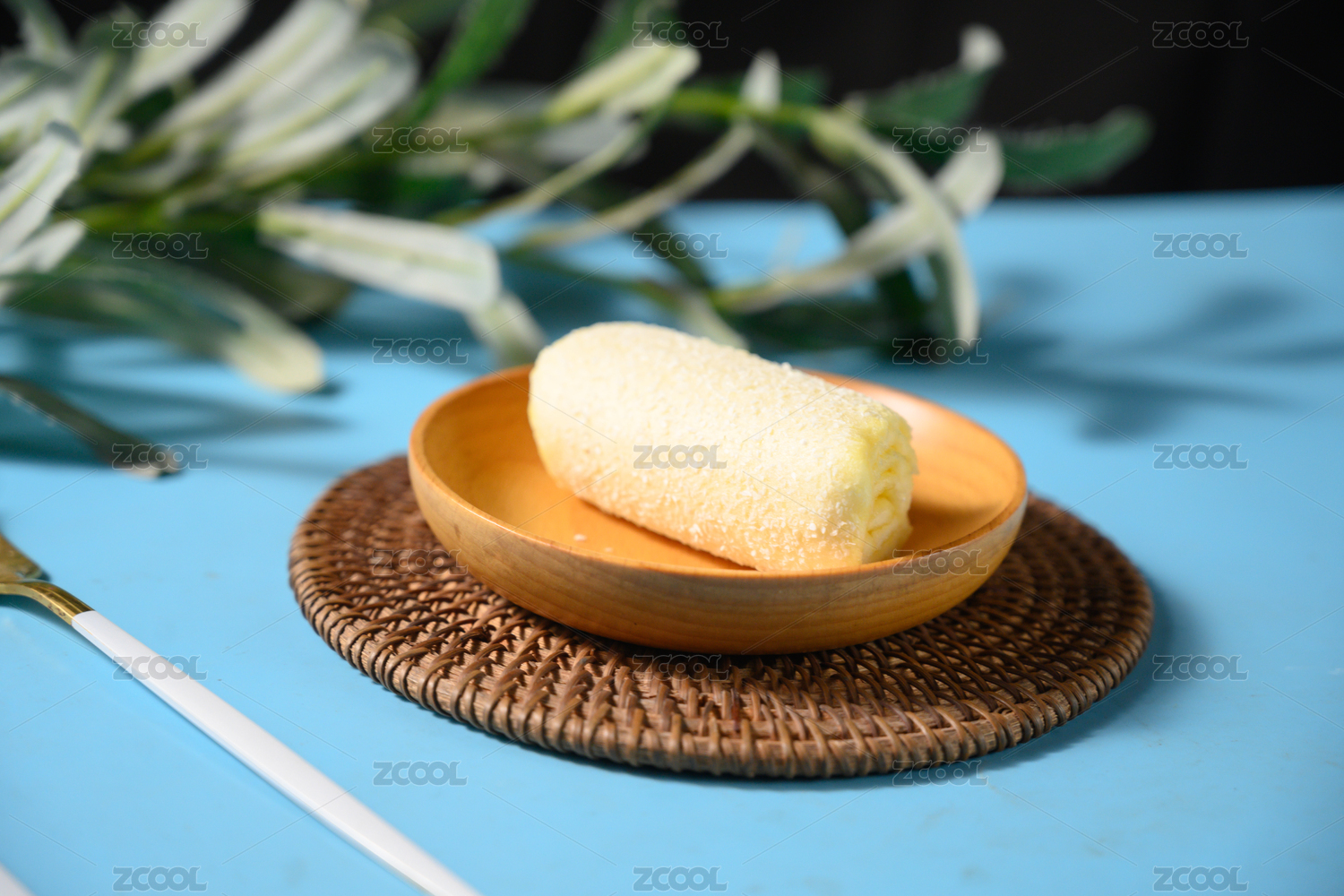 桌面上的盘子里的美味可口的蛋糕卷