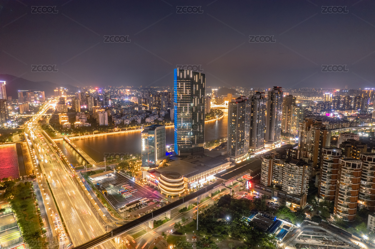 中国广东省珠海环宇城与前山立交晚霞夜景