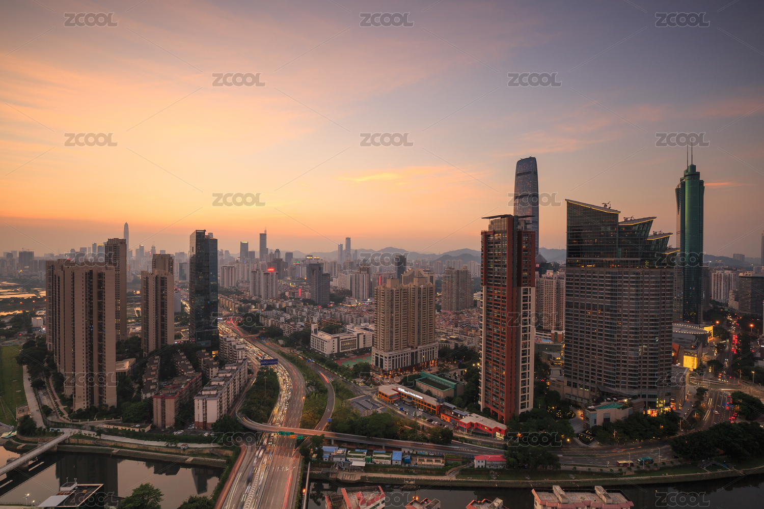 日落后中国广东省深圳罗湖滨河路段天际线