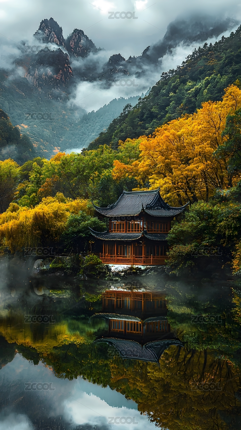 秋天,雾气,宁静氛围,自然风光,古村,传统房屋,黑瓦木结构,枫叶,黄色树叶,橙色花朵