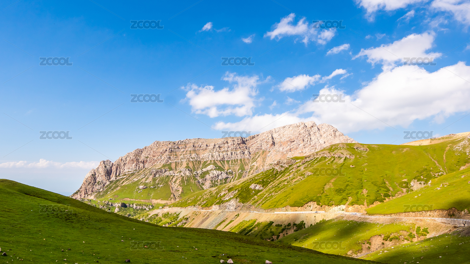 中国新疆夏季蓝天白云下G217独库公路沿途高山草原