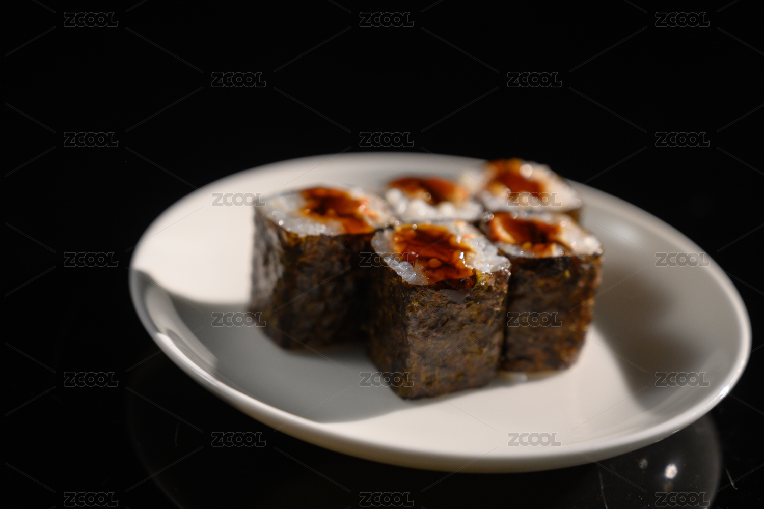 桌面上的盘子里的美味可口的吞拿鱼小卷