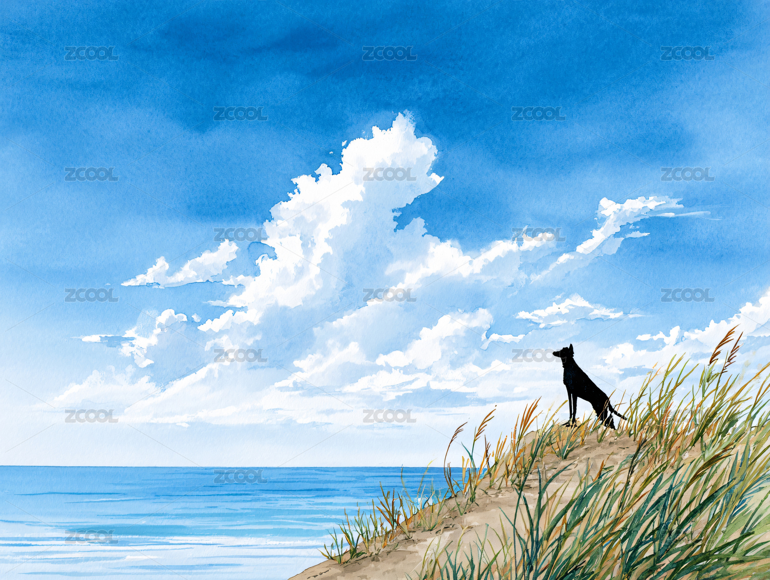 蓝天白云海边狗站在草丛山坡手绘水彩插画