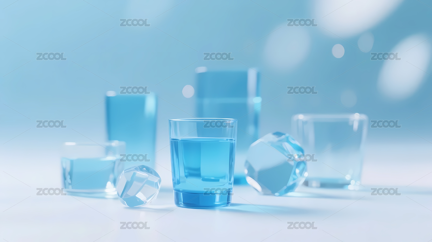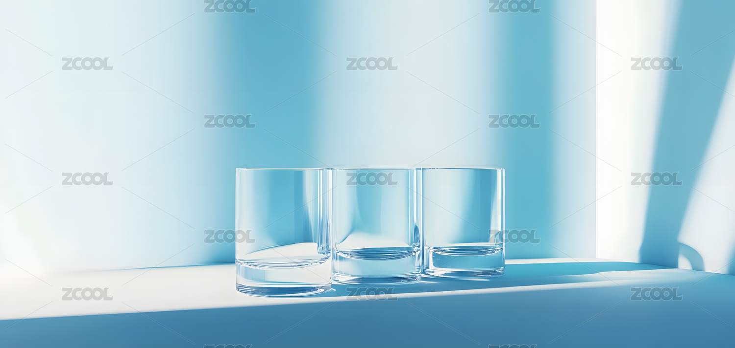 三个透明玻璃杯在蓝白背景上