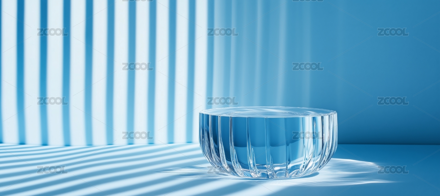 蓝色光影下的透明玻璃展台