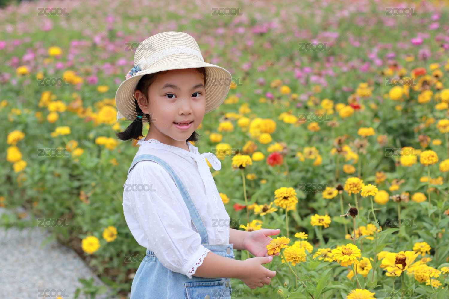 在百日菊花海中玩耍的小女孩