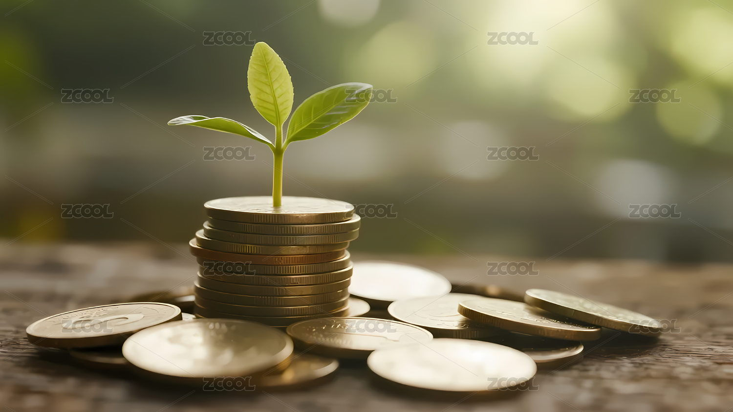 金币堆上绿芽生长象征财富成长