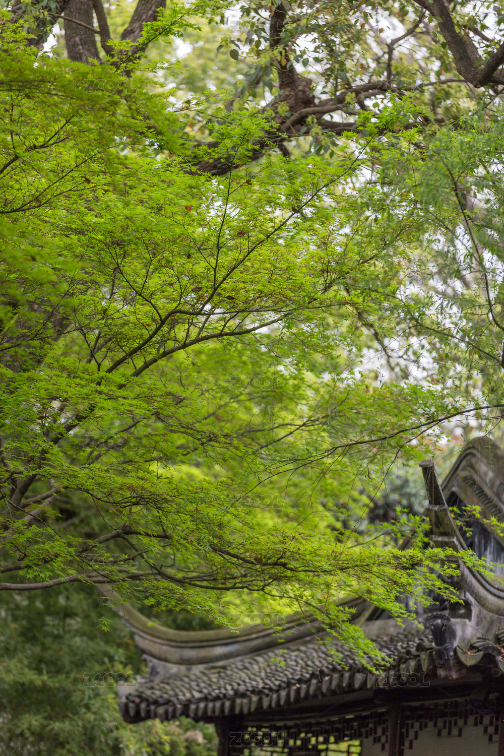 古典园林里的绿色枫叶