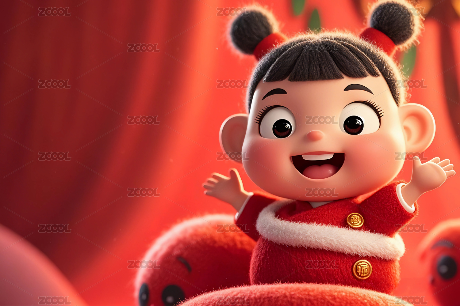 红色背景前喜庆欢度节日的3D卡通娃娃形象