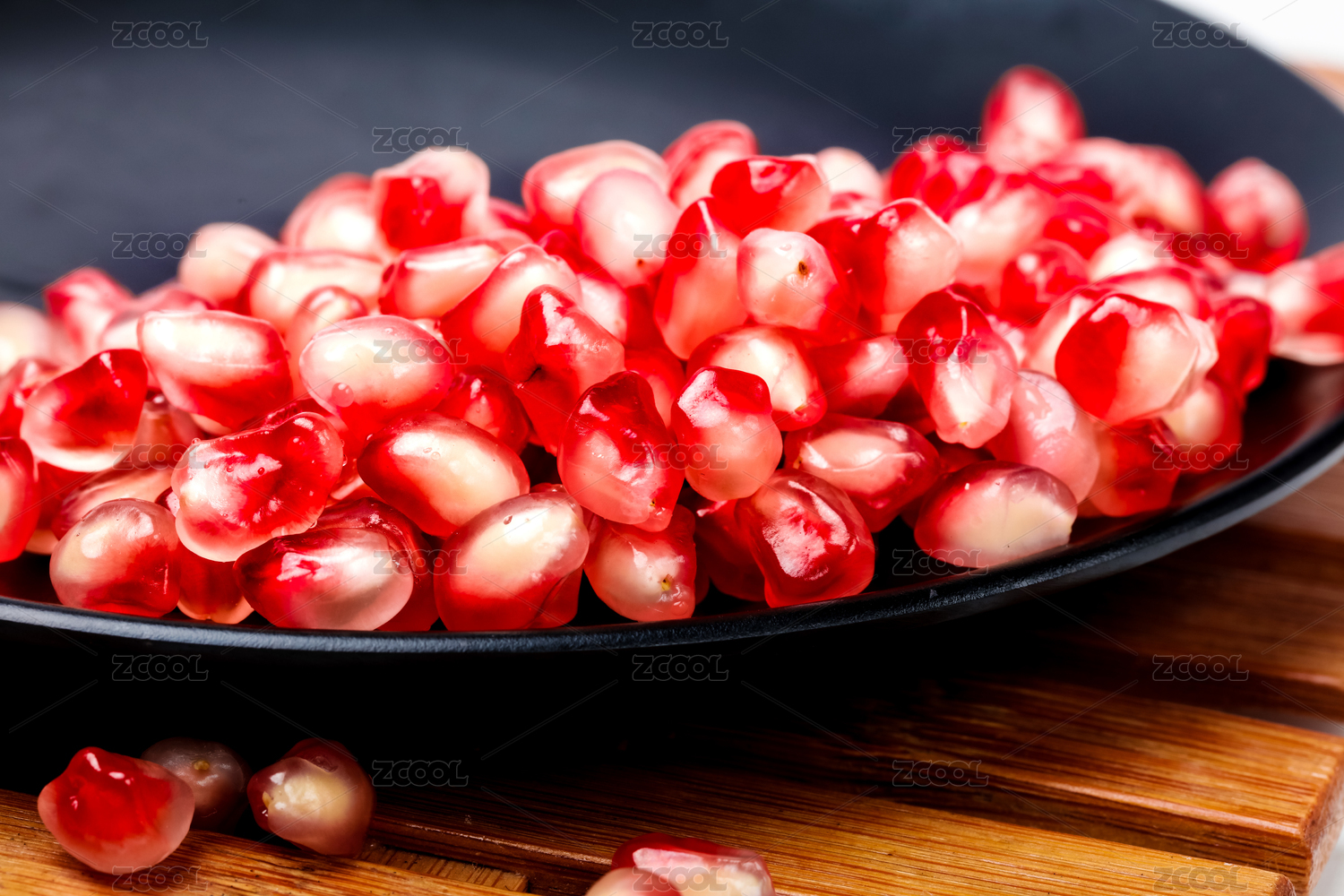 黑色背景满满一盘石榴籽和散落的石榴籽特写