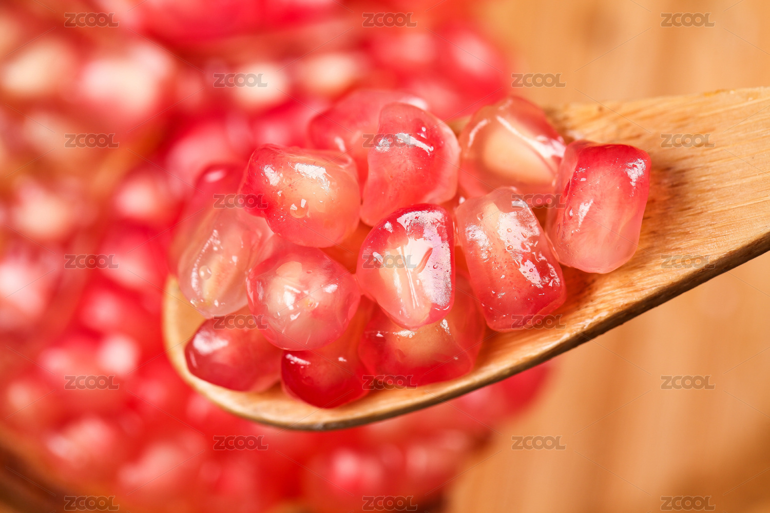 放在木纹背景上碟子里的红色酸甜石榴籽