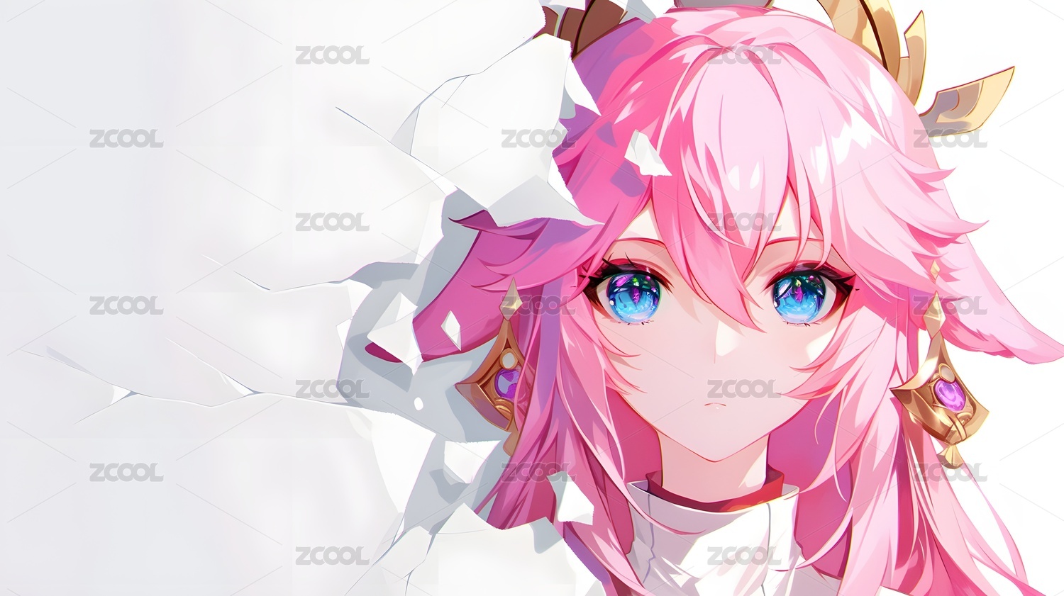 粉色头发蓝眼少女破墙而出二次元动漫插画