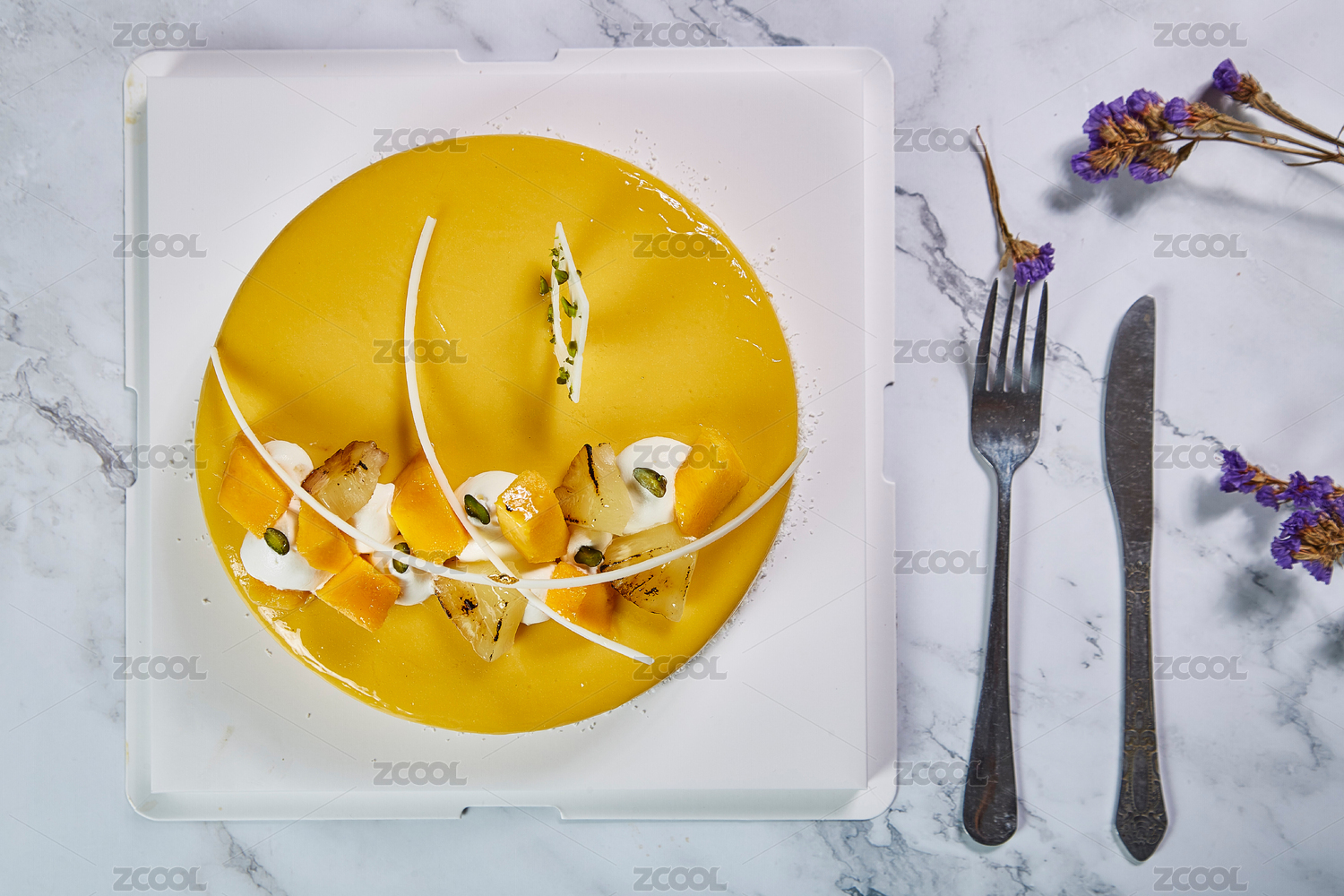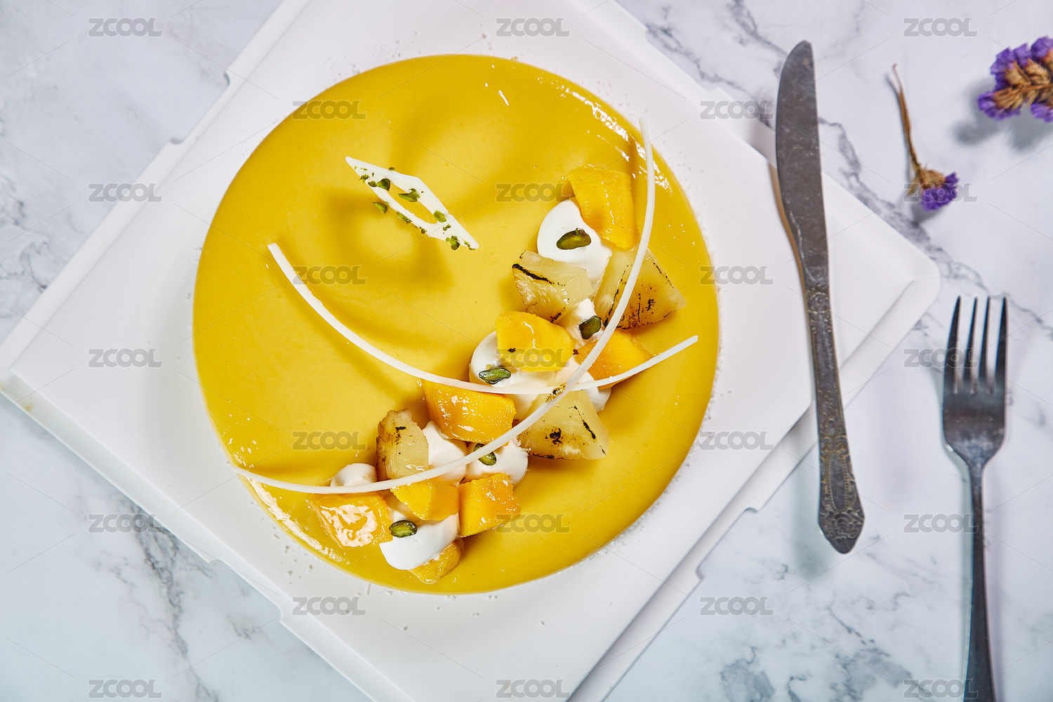 大理石桌面上的芒果慕斯蛋糕
