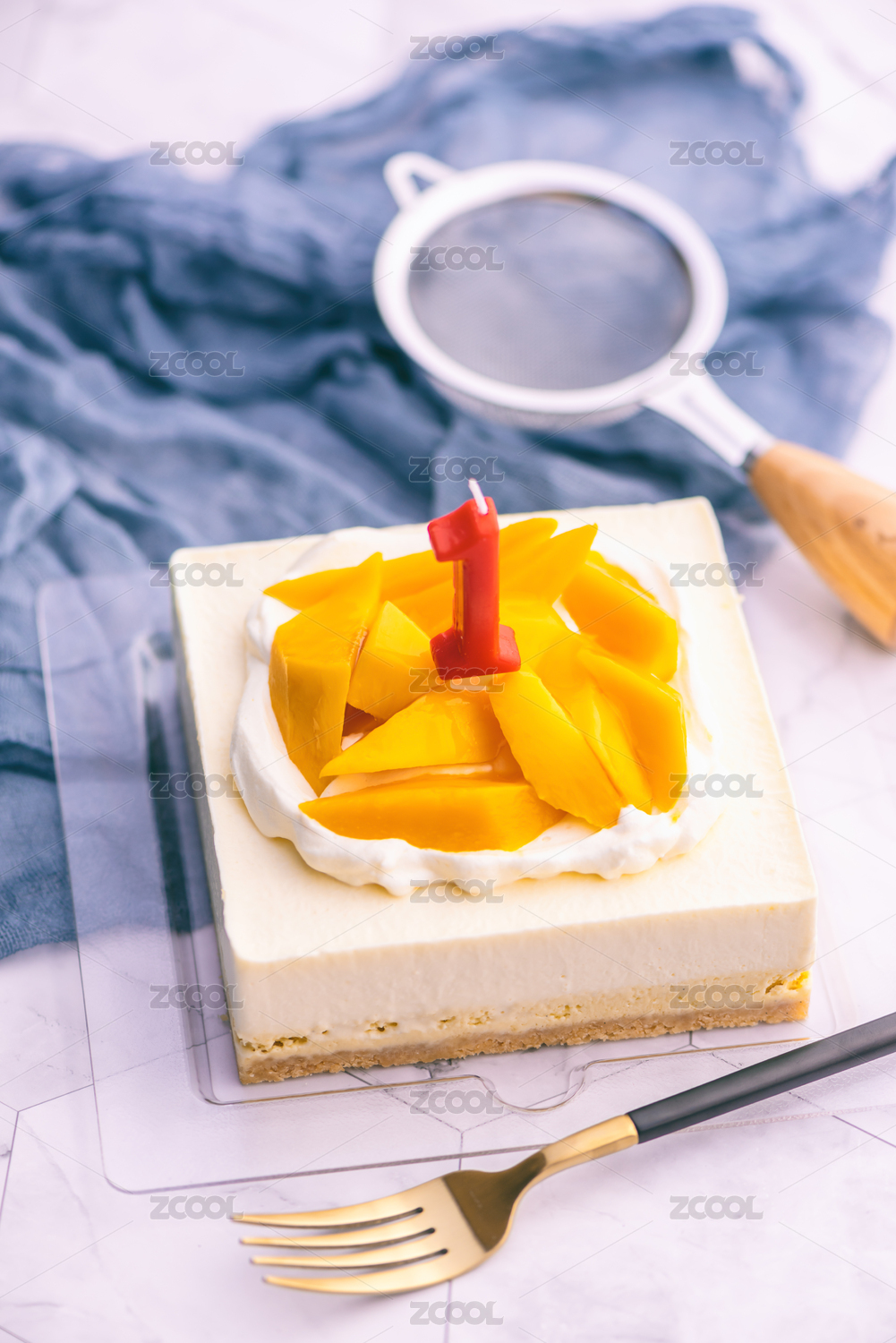 室内影棚拍摄插着数字1蜡烛的芒果奶油蛋糕