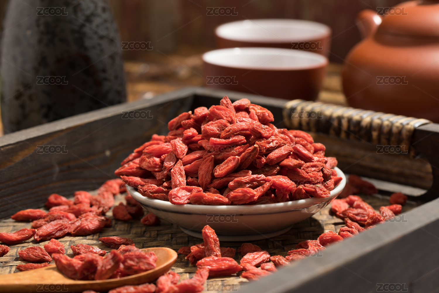 装有中式药材枸杞子的白瓷碟放在木盘里